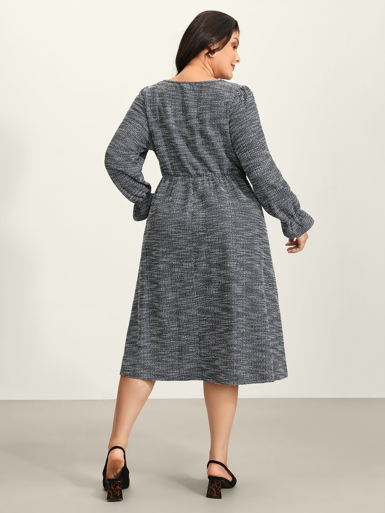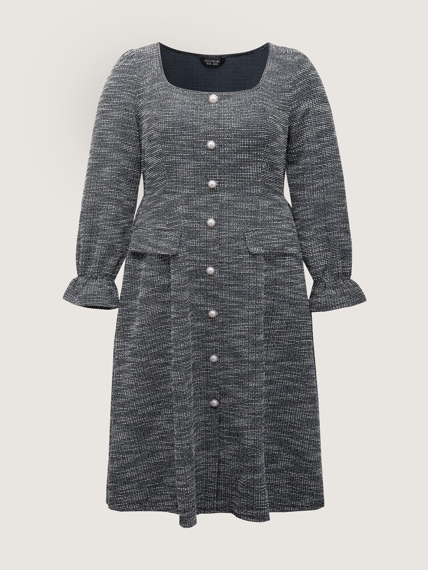 Tweed Knit Pearl Button Stretchy Midi Dress