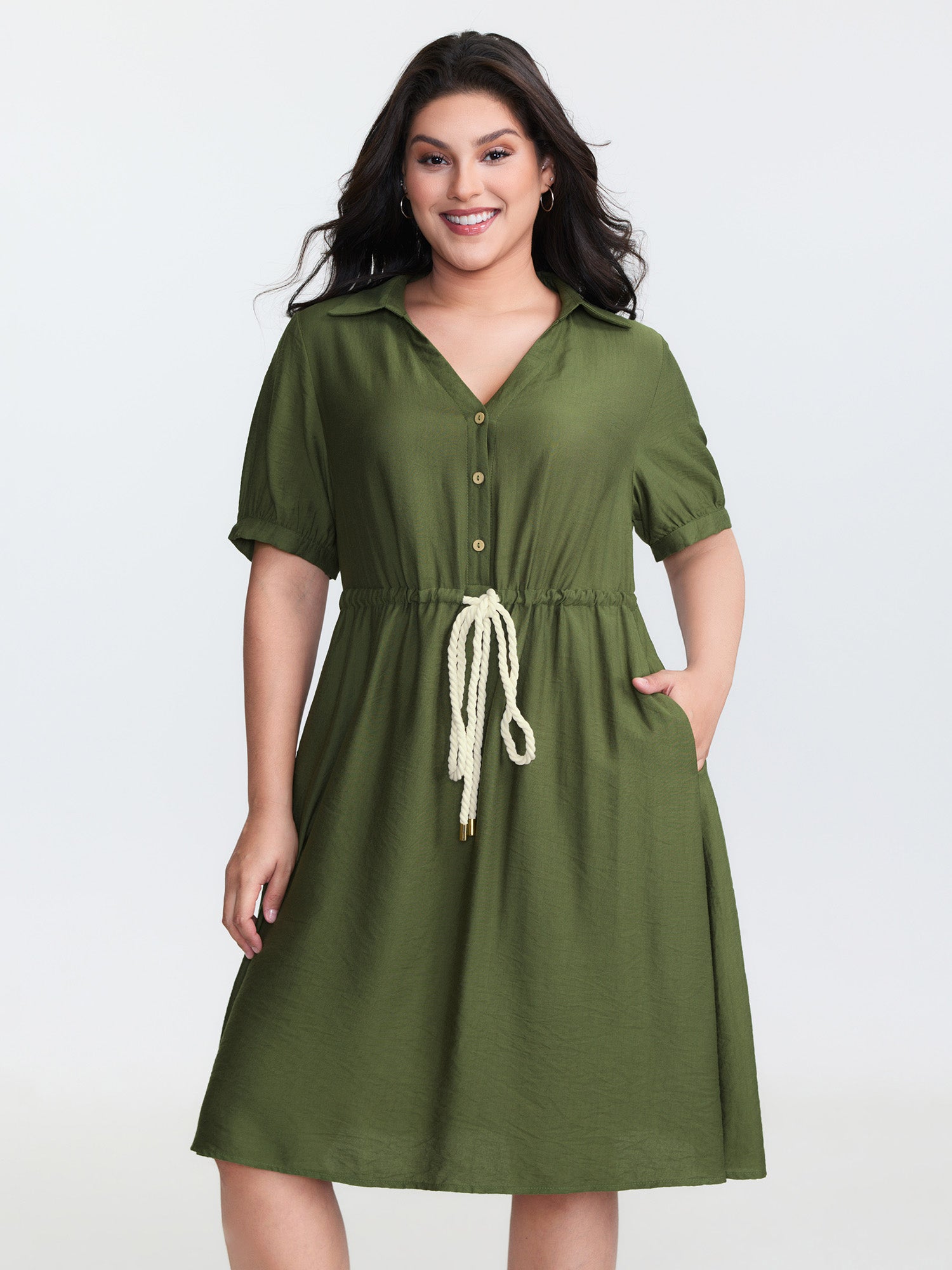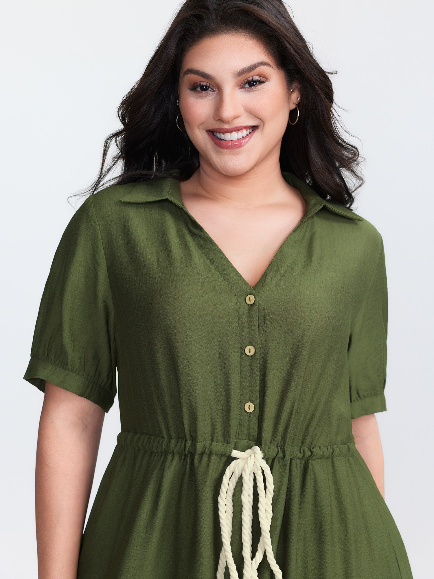 Rayon Slub Waist-Tie Button Midi Dress