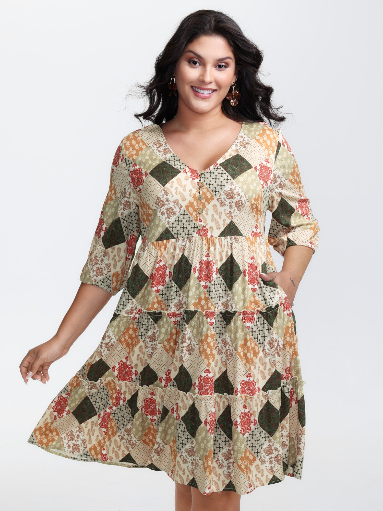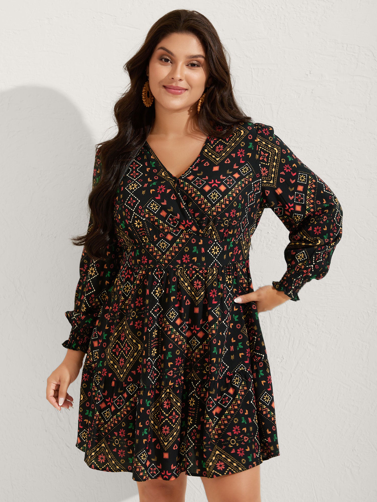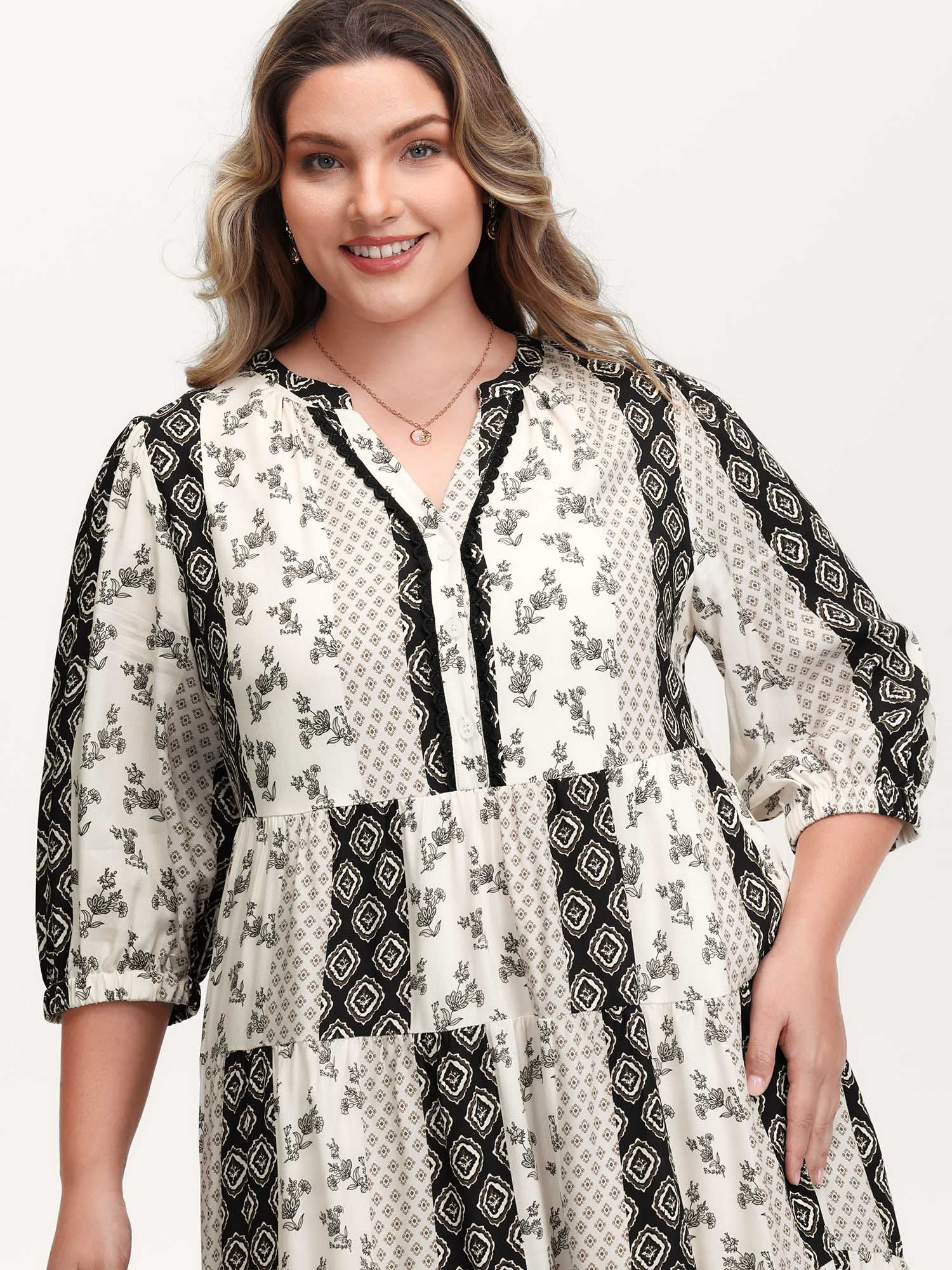 Geometric Print Flared Sleeve Tiered Midi Dress