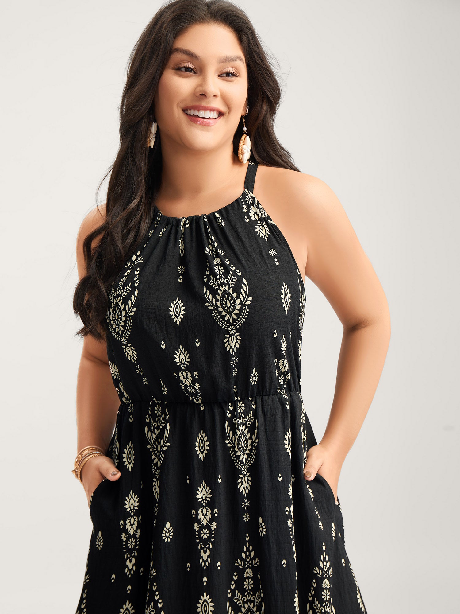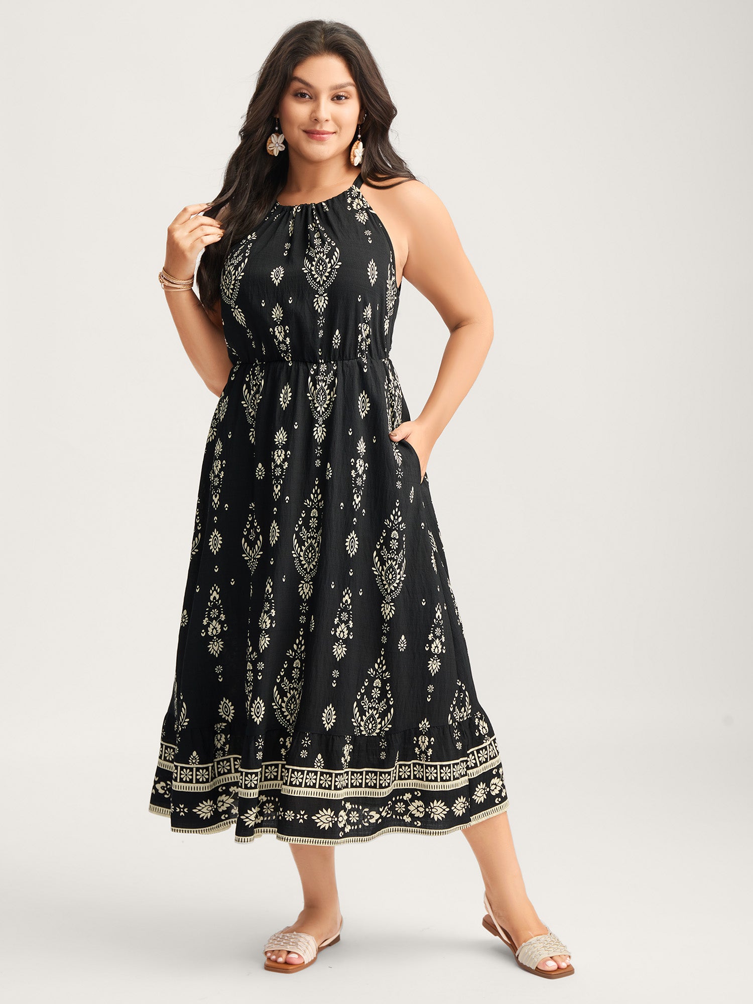 Boho Print Halter Neck Pockets Midi Dress