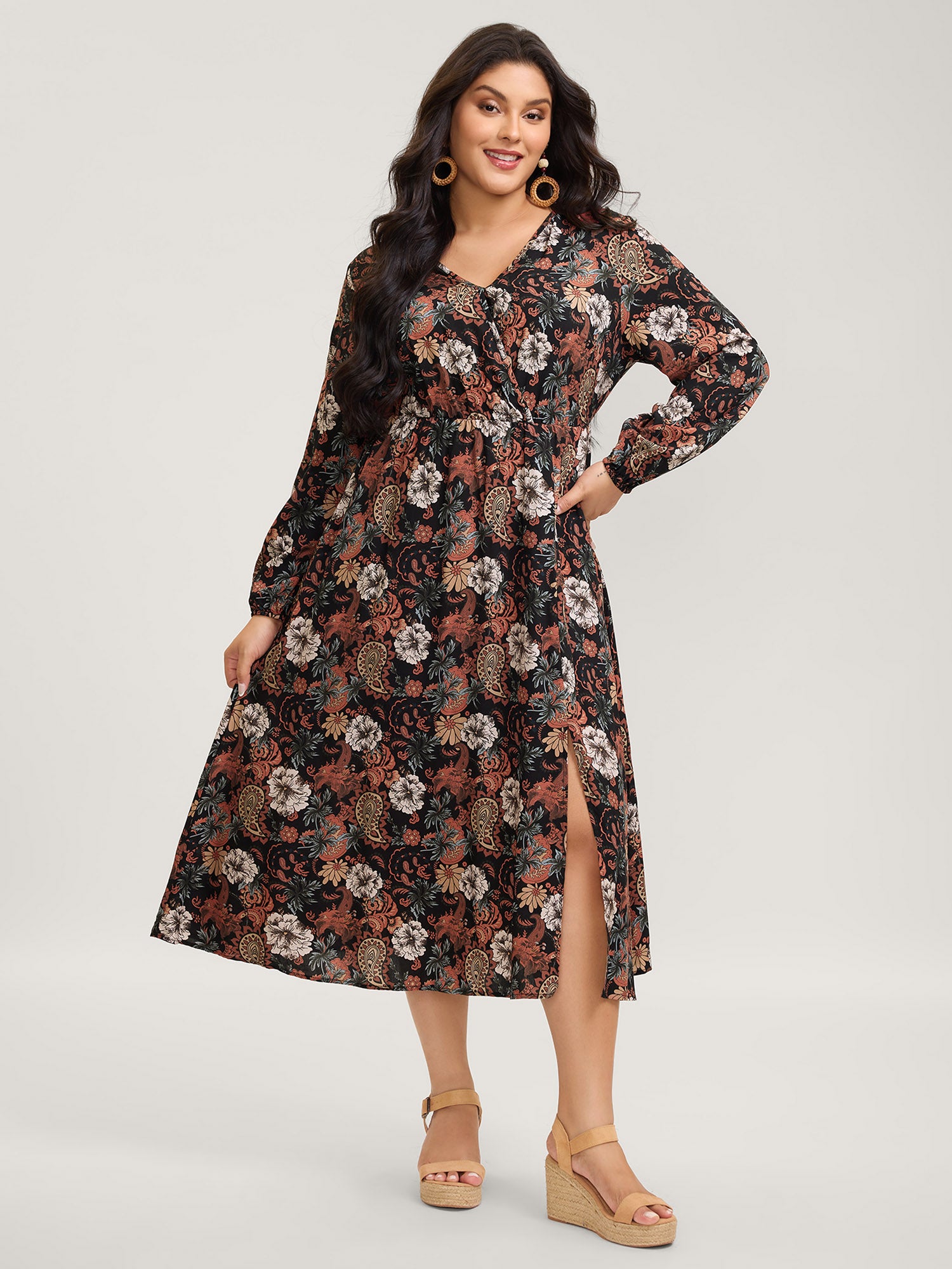 Fall Floral Print Surplice Neck Midi Dress