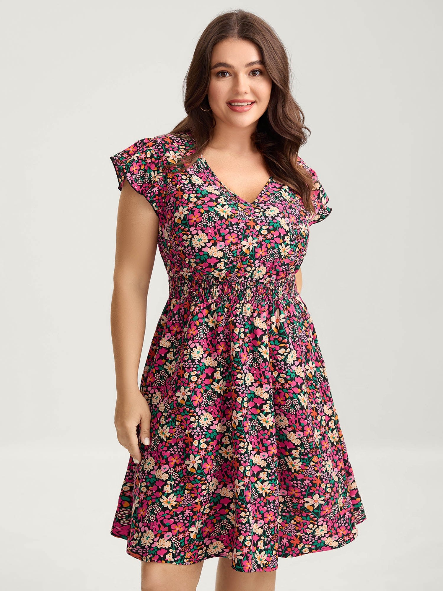 Floral Print Shirred Waist Ruffled Midi Dress