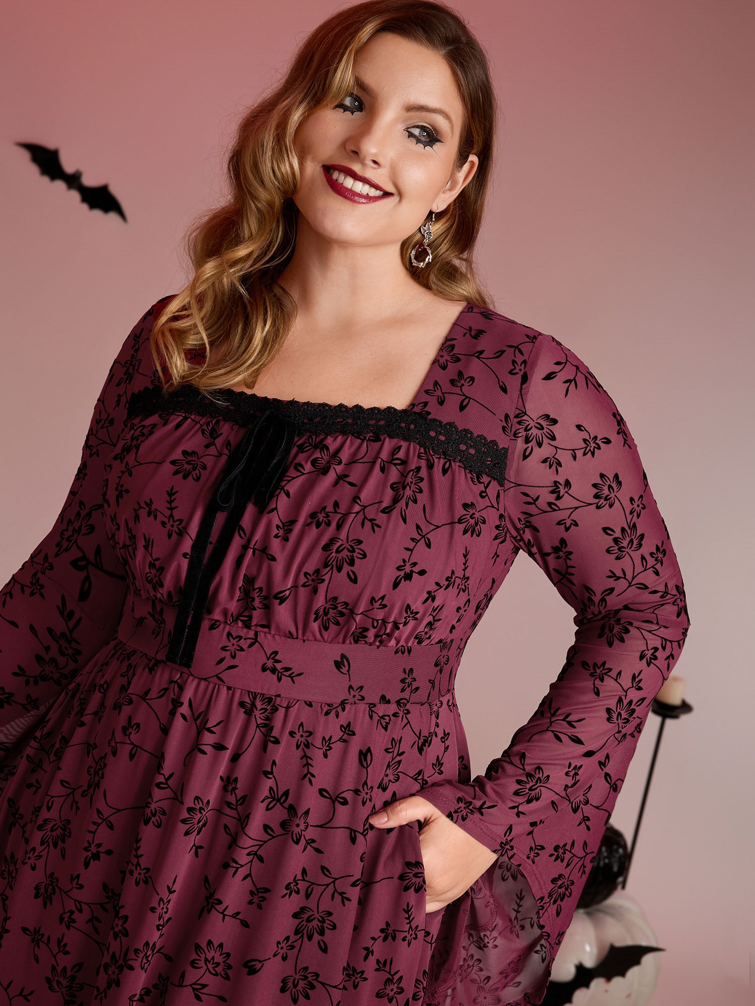 Floral Flocked Lace Cinched-Waist Midi Dress