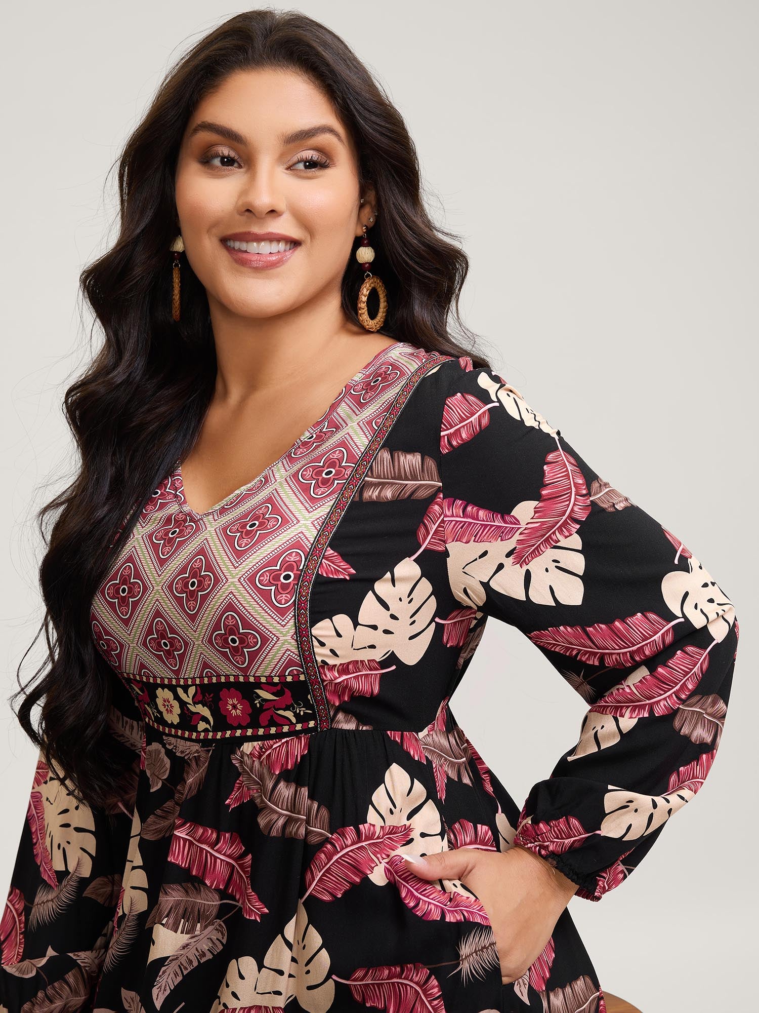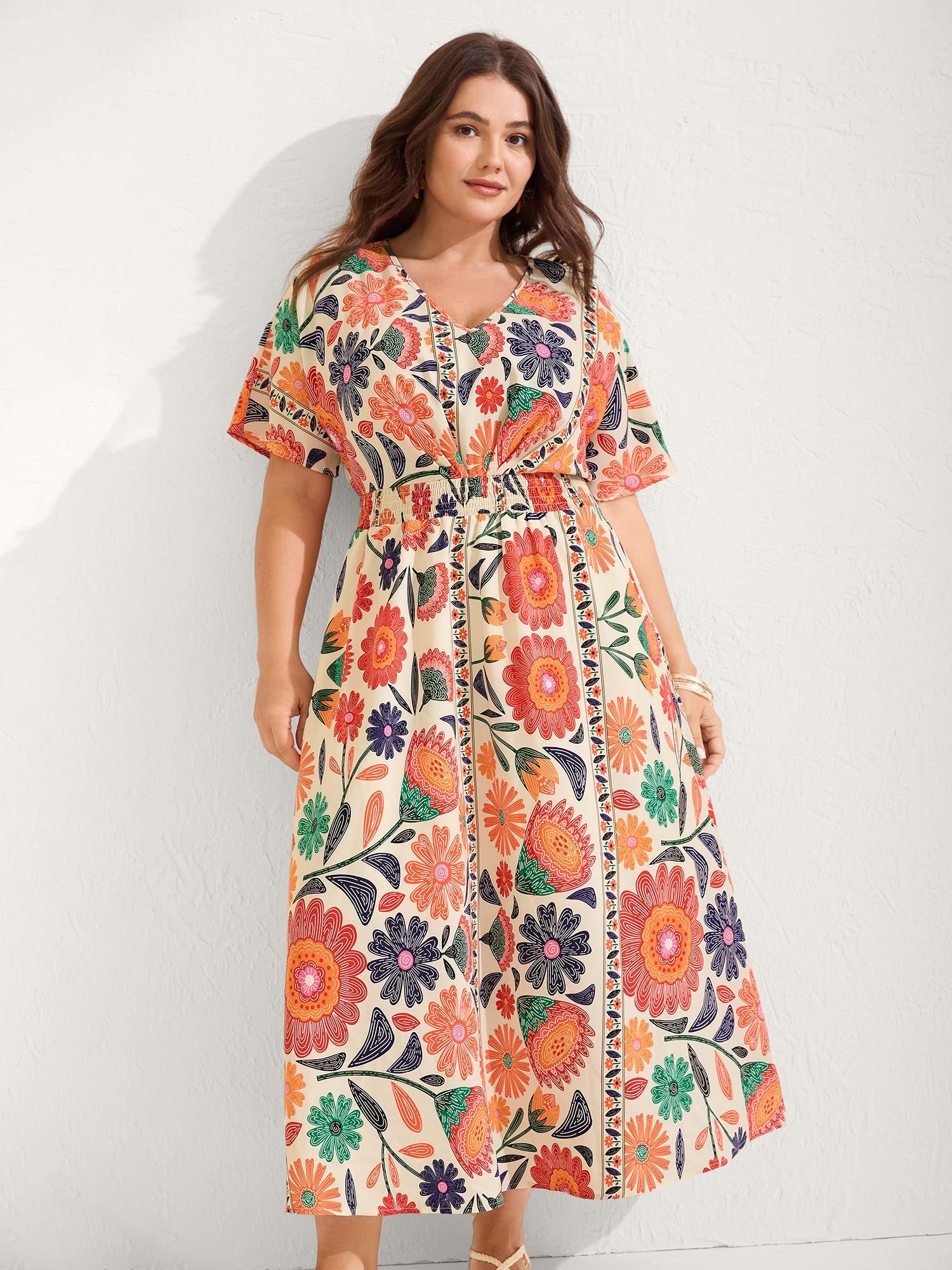 Supersoft Shirred Boho Collage Midi Dress