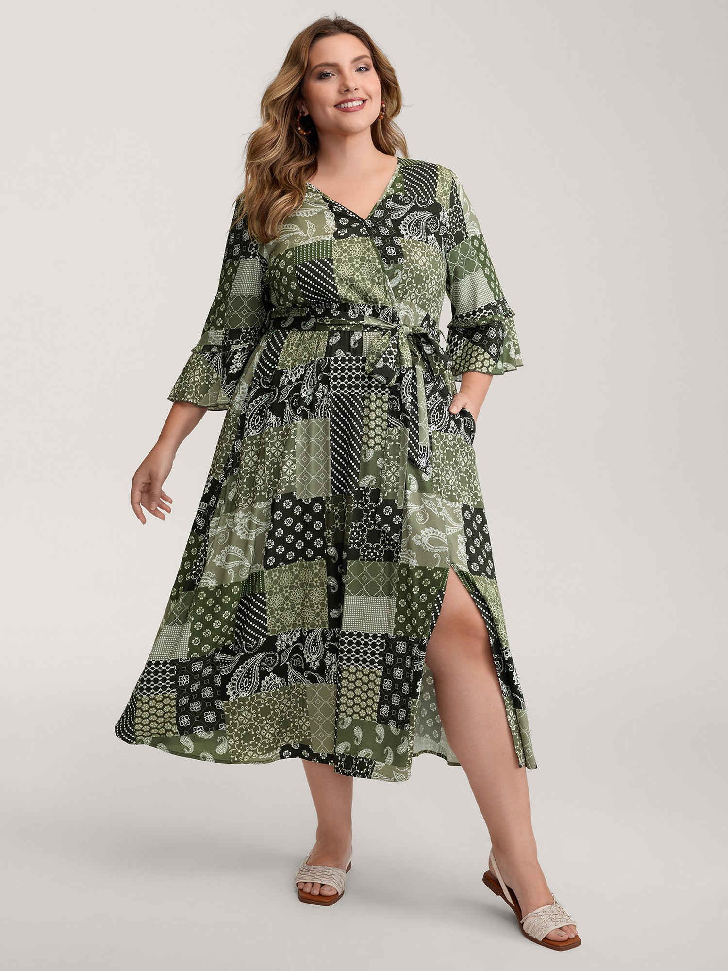 Boho Print Wrap Neckline Belted Maxi Dress