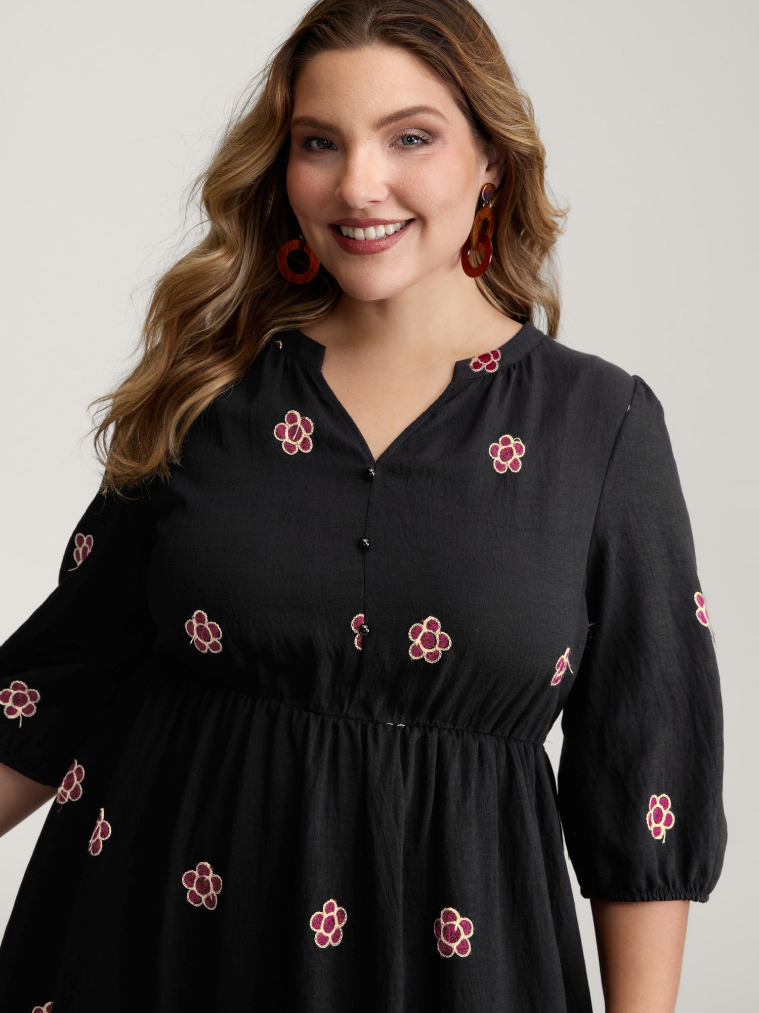 Floral Embroidery Notched Collar Knee-Length Dress