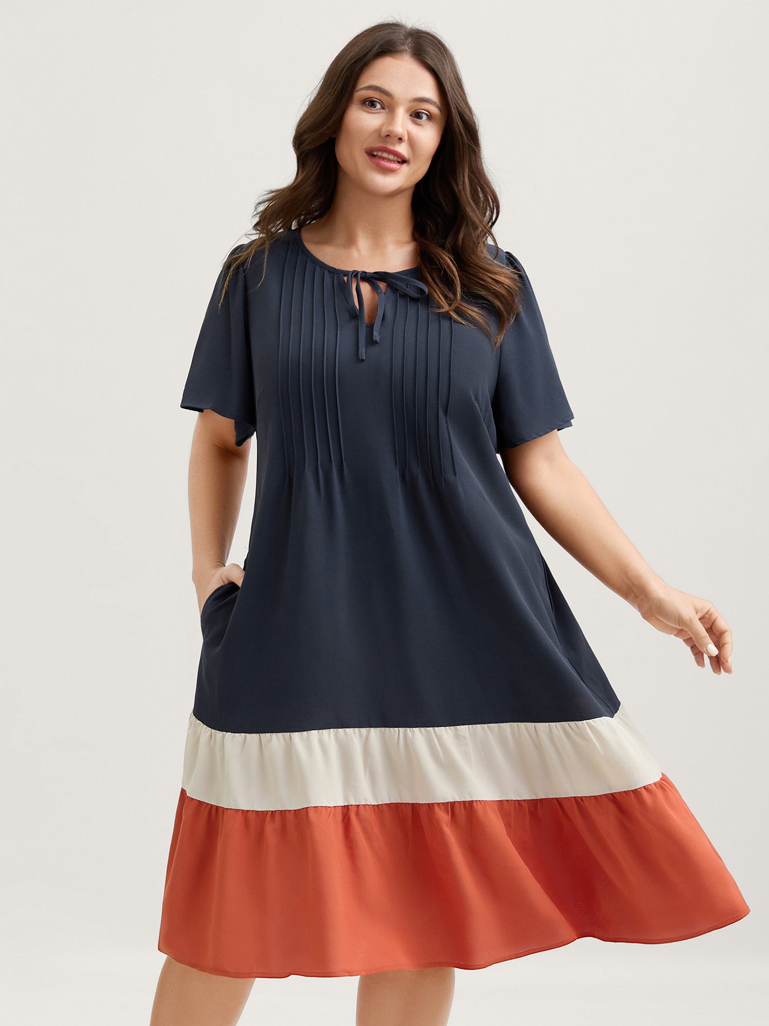 Color Contrast Plicated Detail Midi Dress