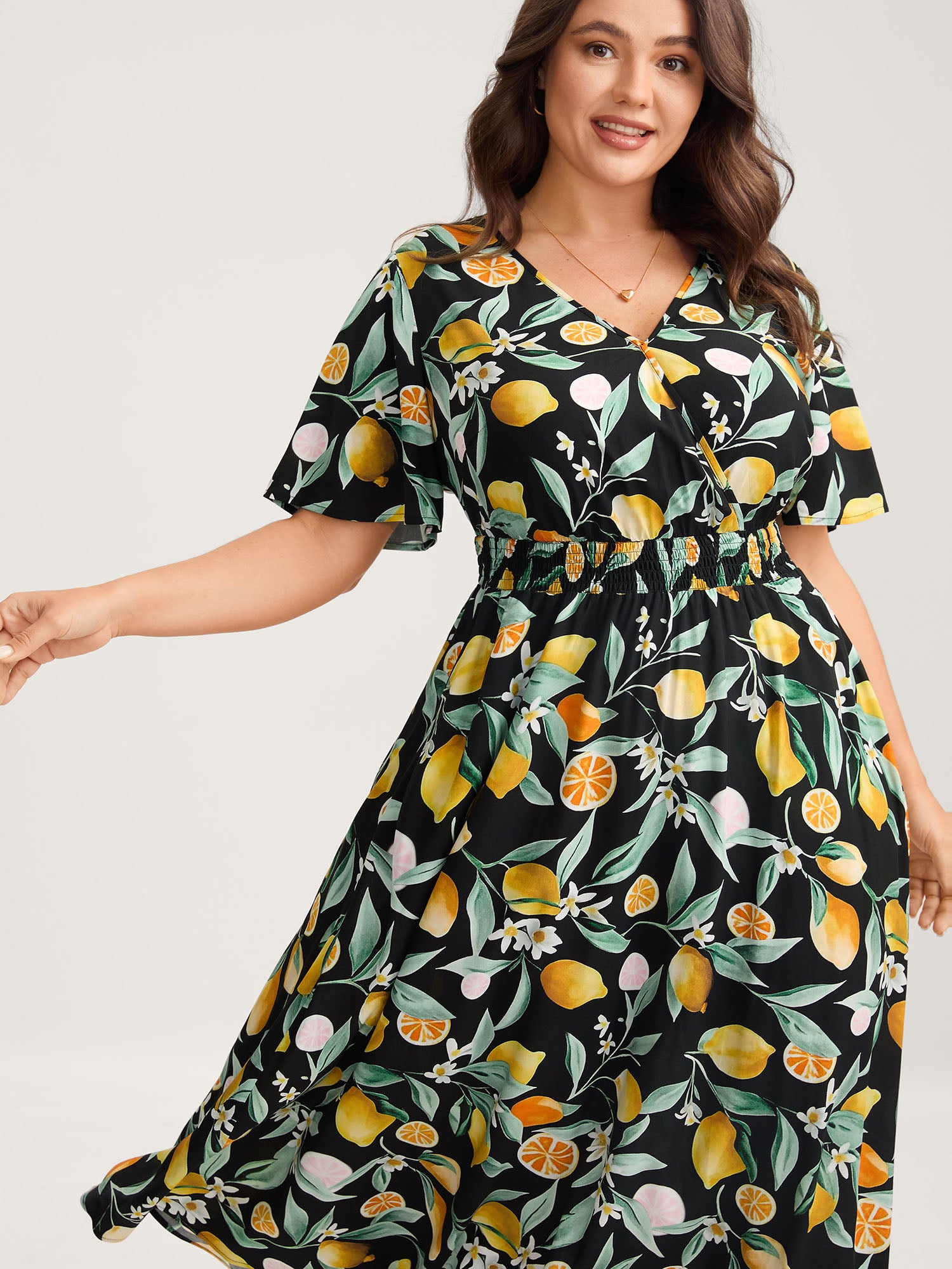 Citrus Print Overlap Neck Shirred Midi Dress
