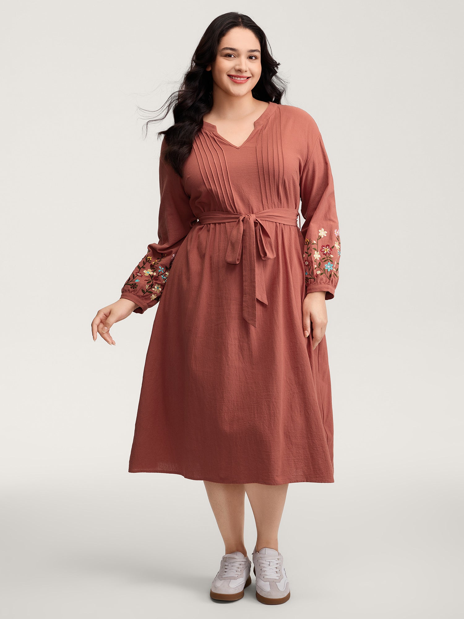 Cotton Embroidered Sleeve Waist-Tie Midi Dress
