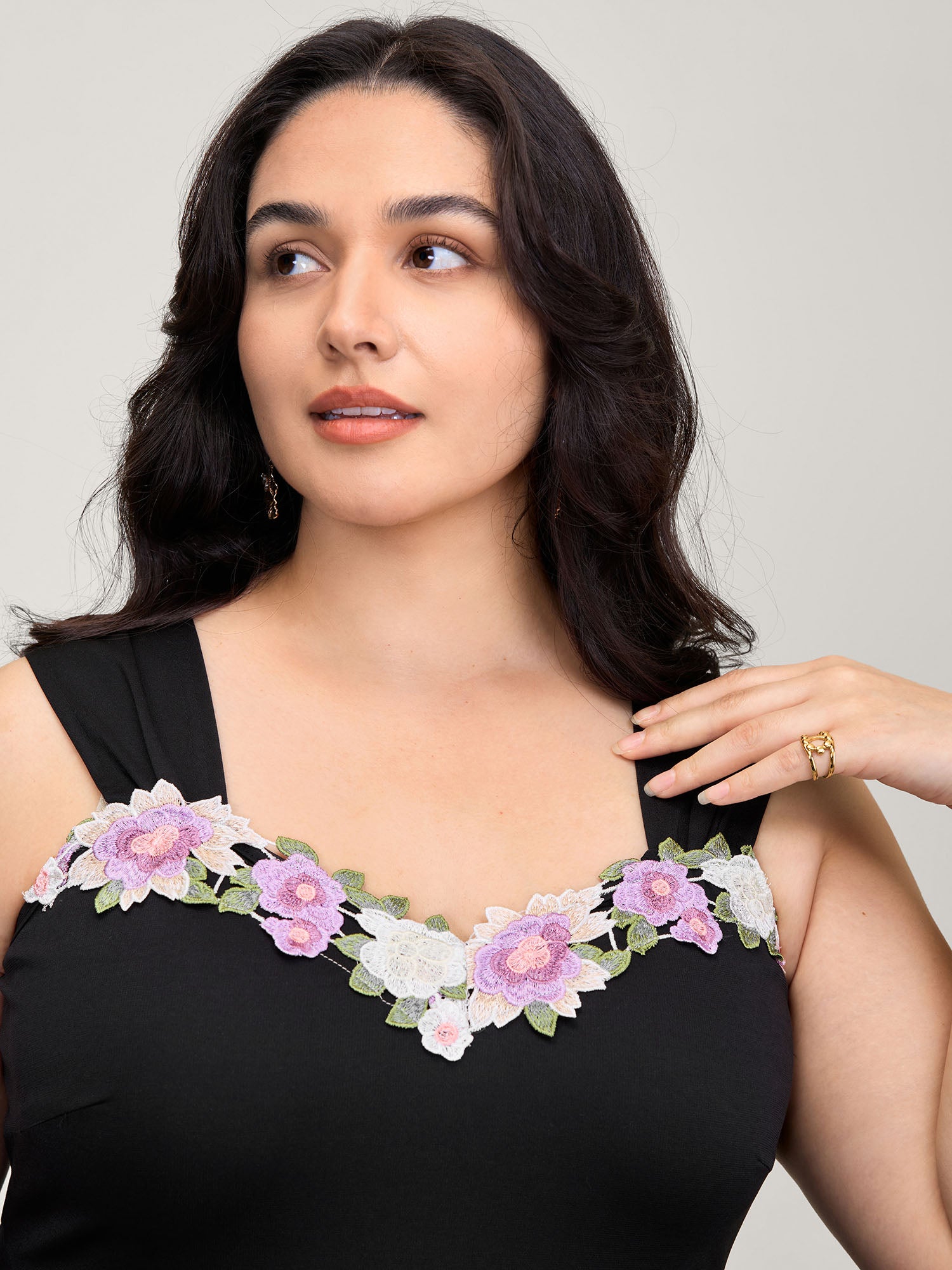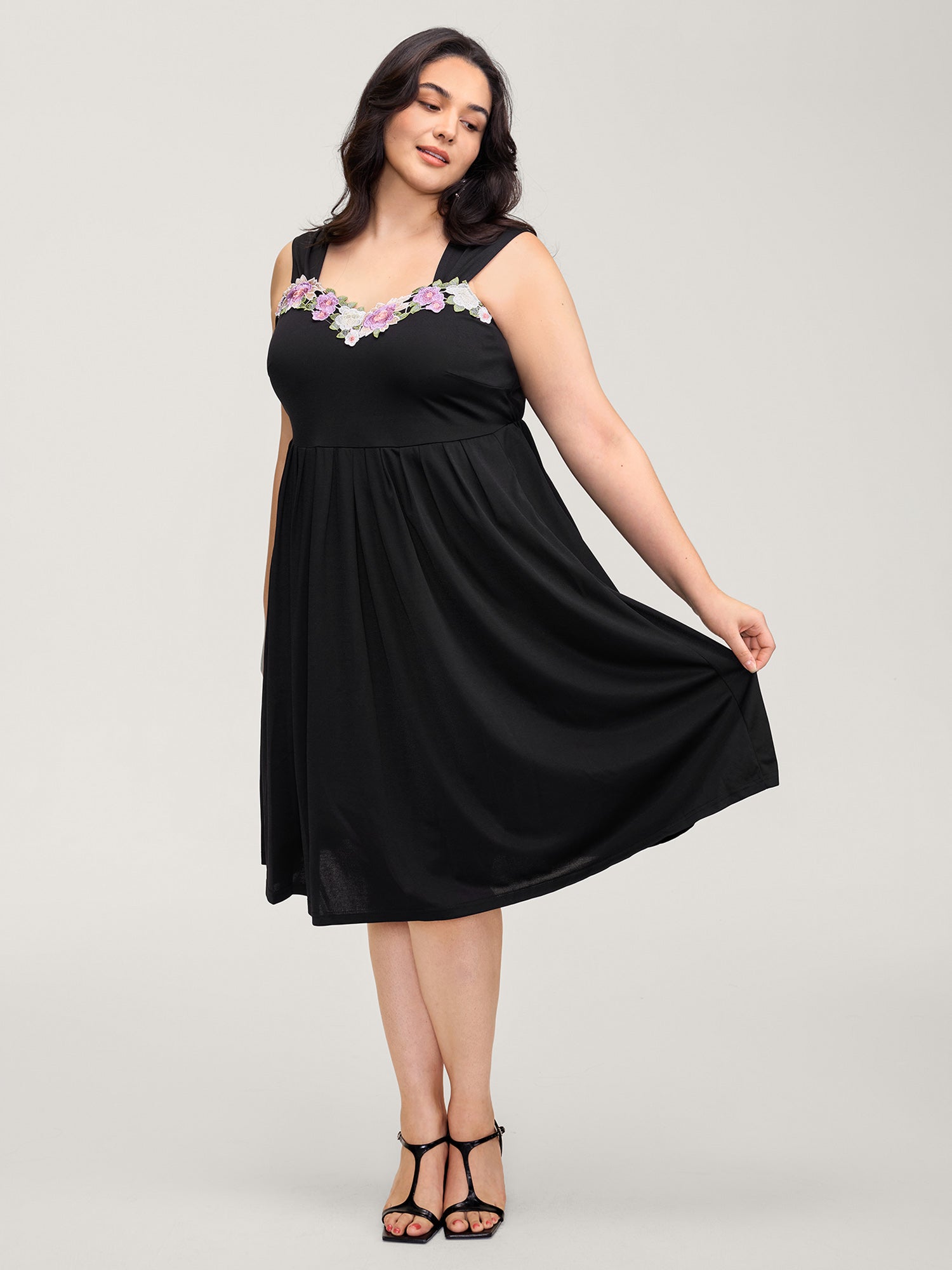 Floral Embroidered Neckline Lace Trim Midi Dress