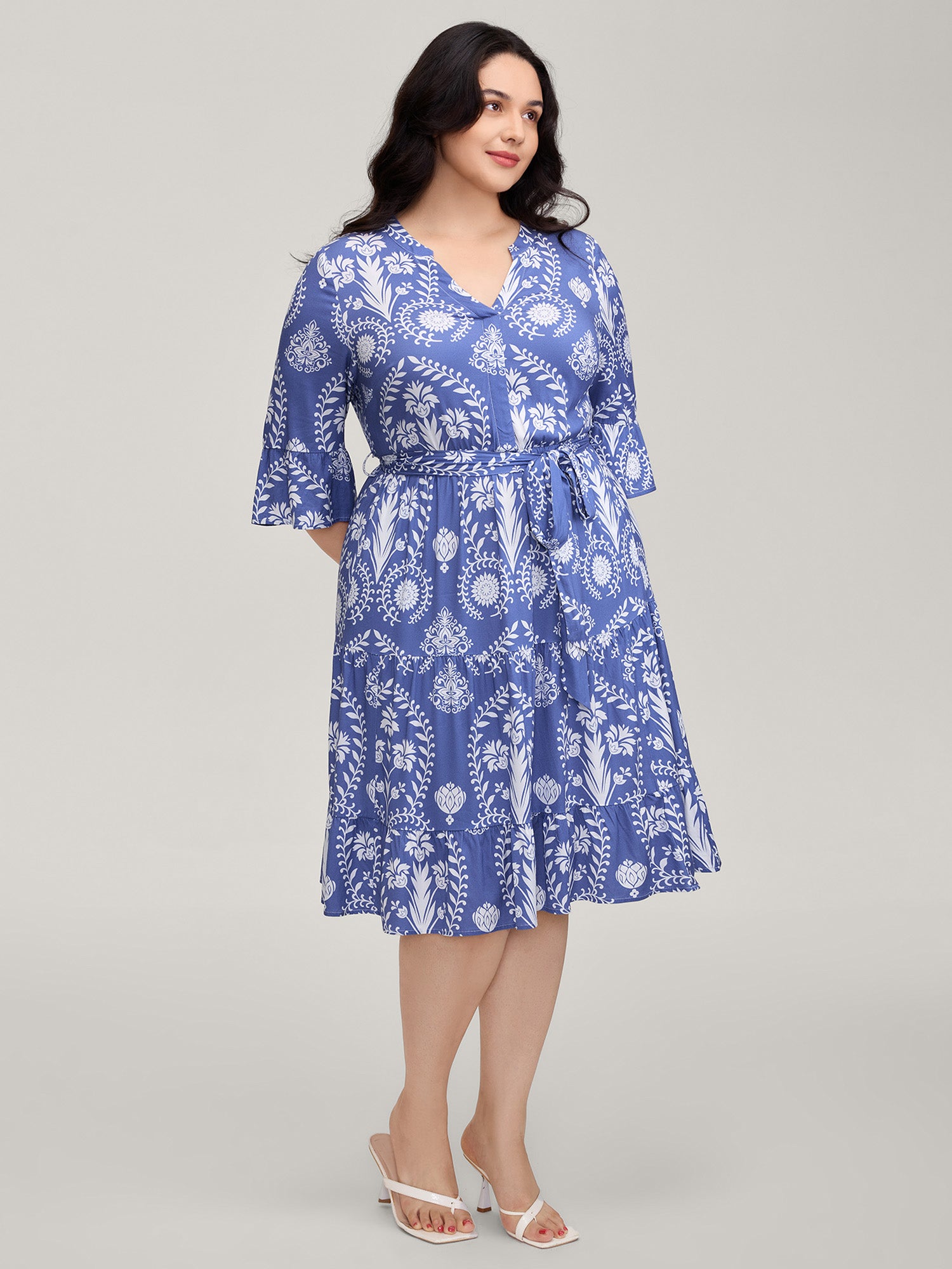 Plain V Neck Mesh Pocket Ruffle Tiered Belted Midi Dress