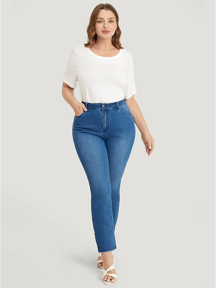 Shop Very Stretchy High Rise Medium Wash Lace Insert Raw Hem Jeans now and redefine your style with confidence at BloomChic. Tailored for mid and plus-size women. This trendy Denim Women, sizes 10-30. Color:Indigo;Style:Casual Dailywear;Pattern Type:Plain;Details:Lace, Patchwork;Pocket:Side seam pocket;Belt:No-belt;Closure Type:Zipper;Wash:Medium Wash