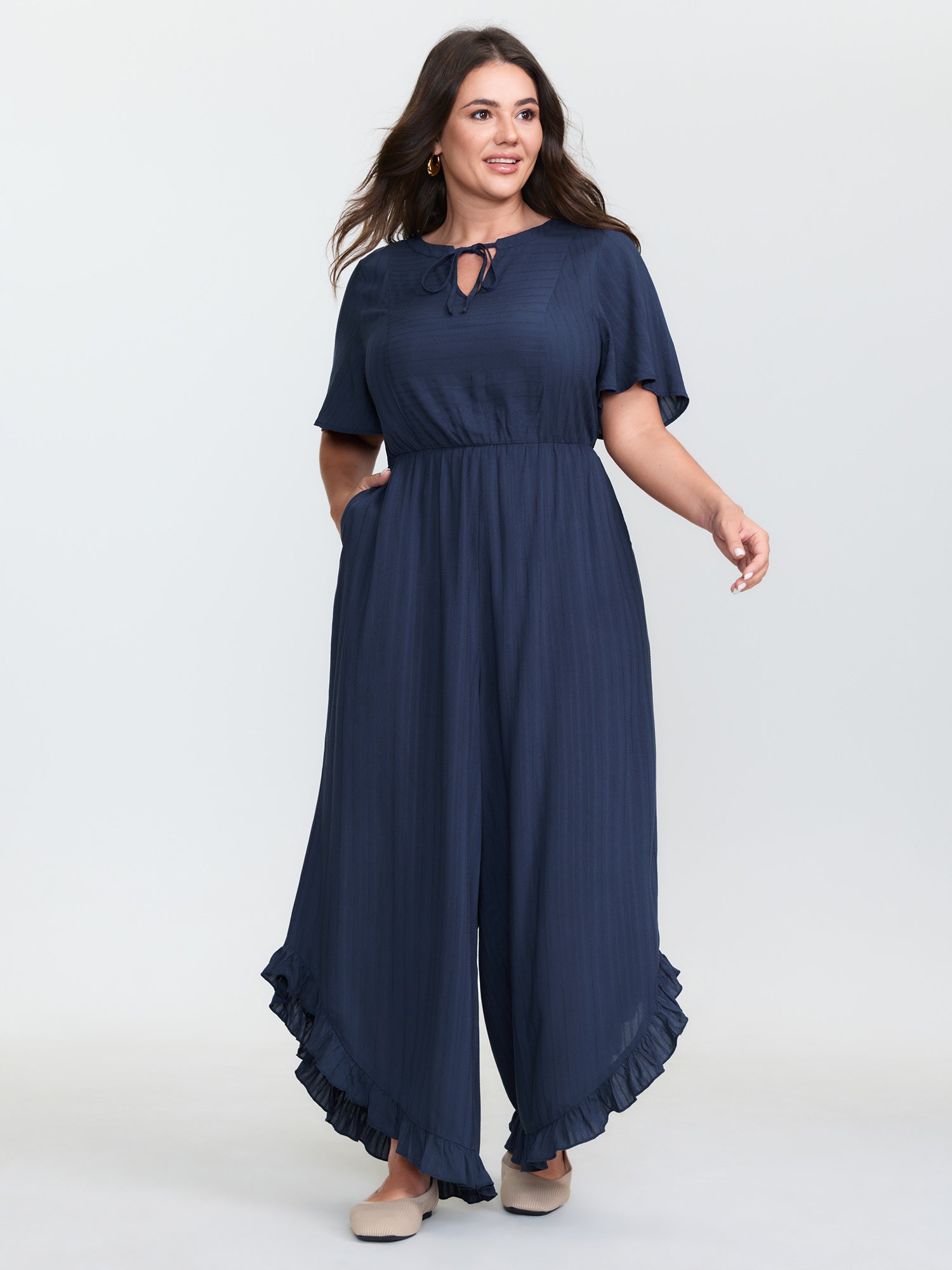Textured Ruffled Backless Tie Jumpsuit
