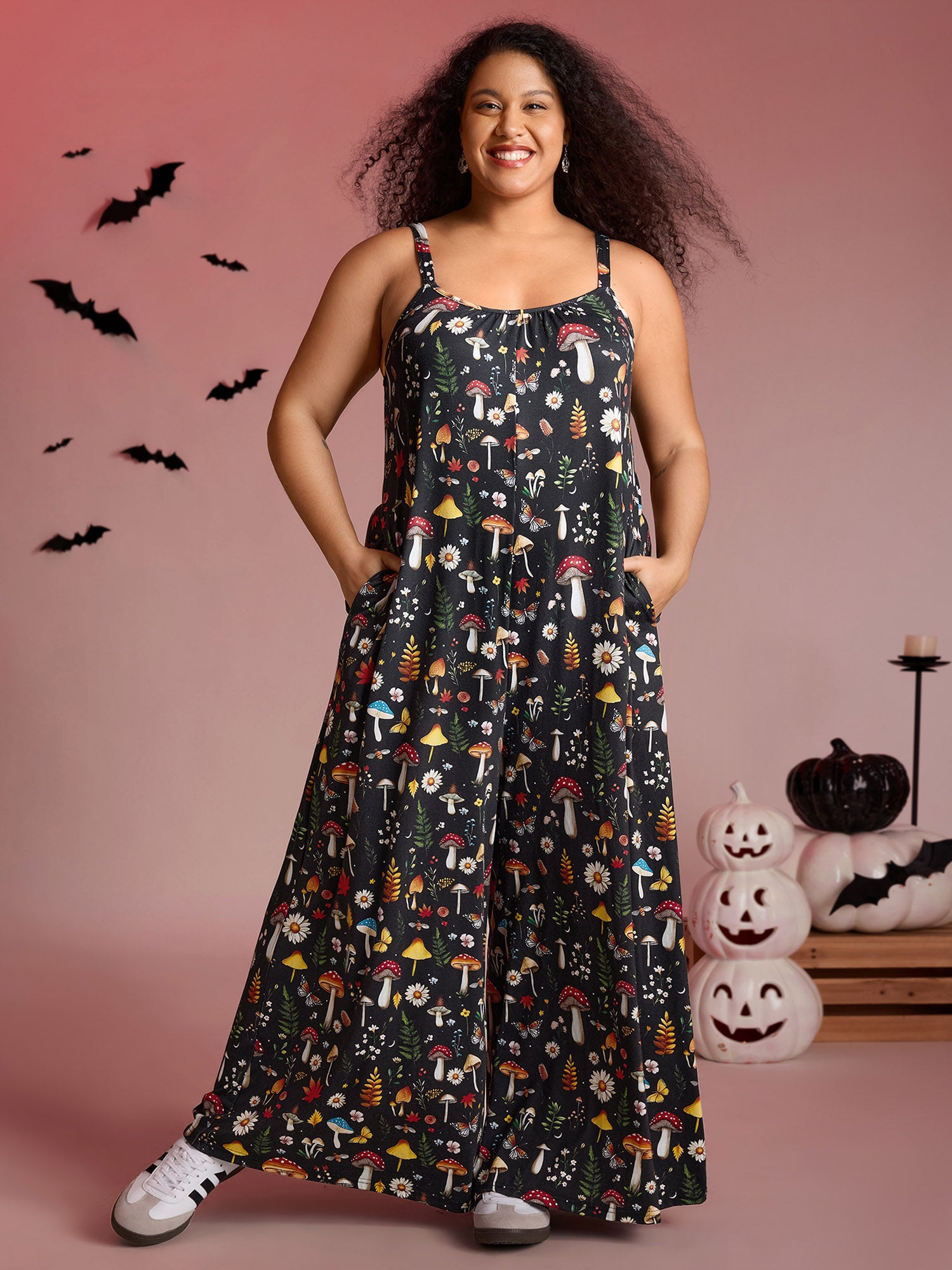 Halloween Mushroom Print Pockets Cami Jumpsuit