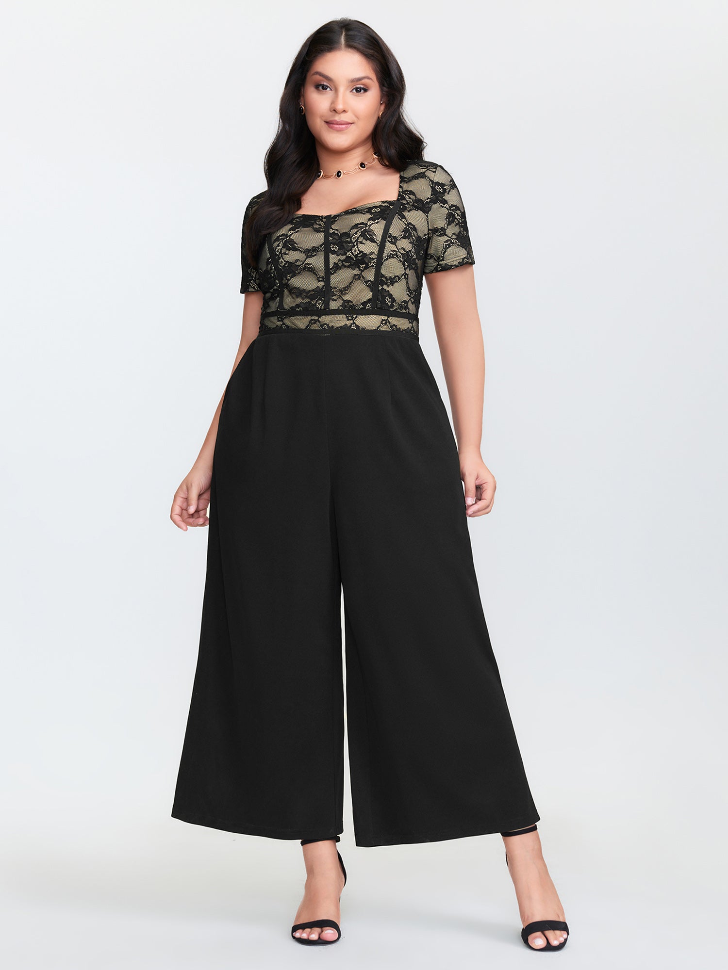 Geometric Lace Trim Sheer Wide-Leg Jumpsuit