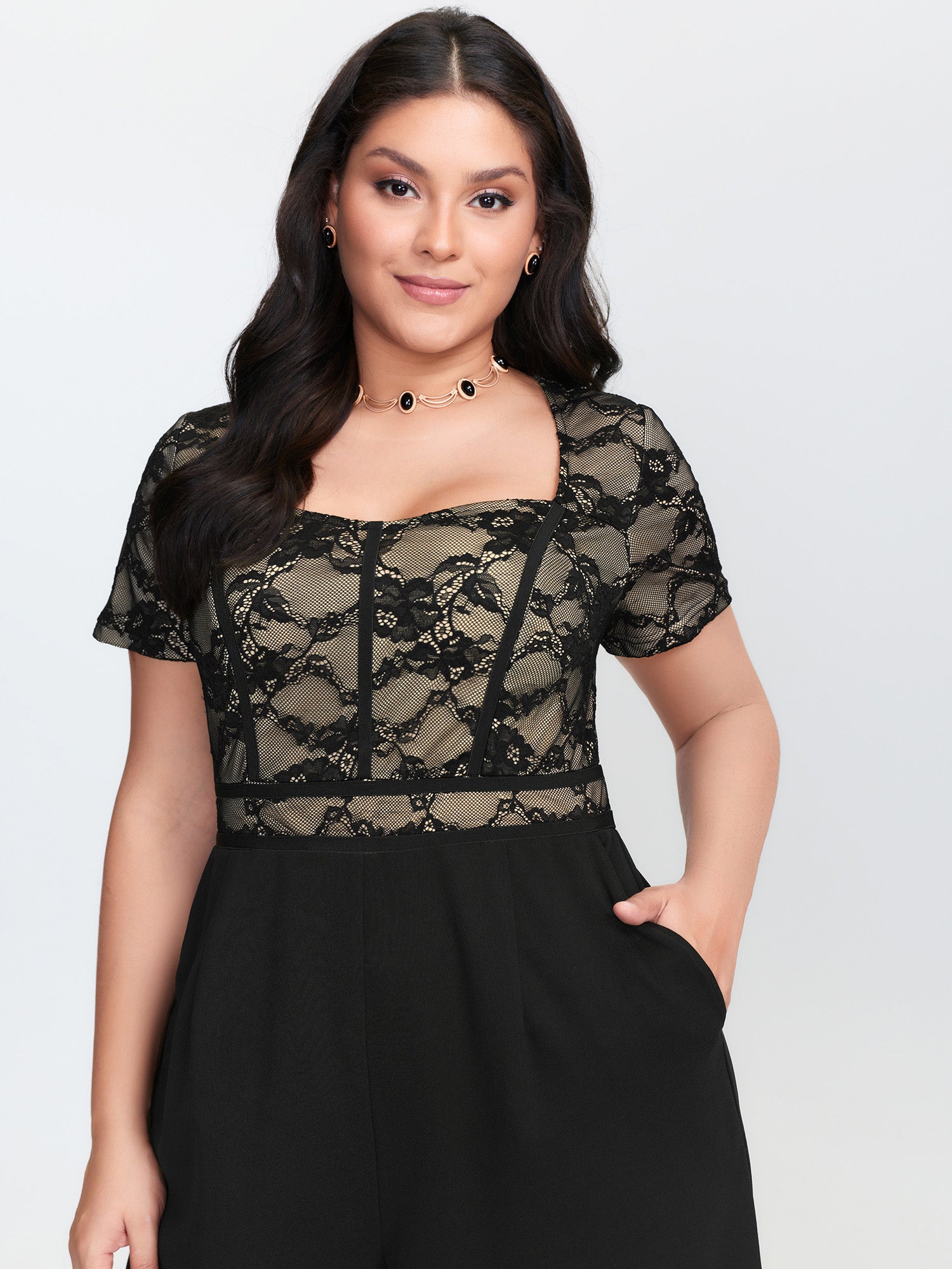 Lace Trim Stretchy Waist Pockets Jumpsuit