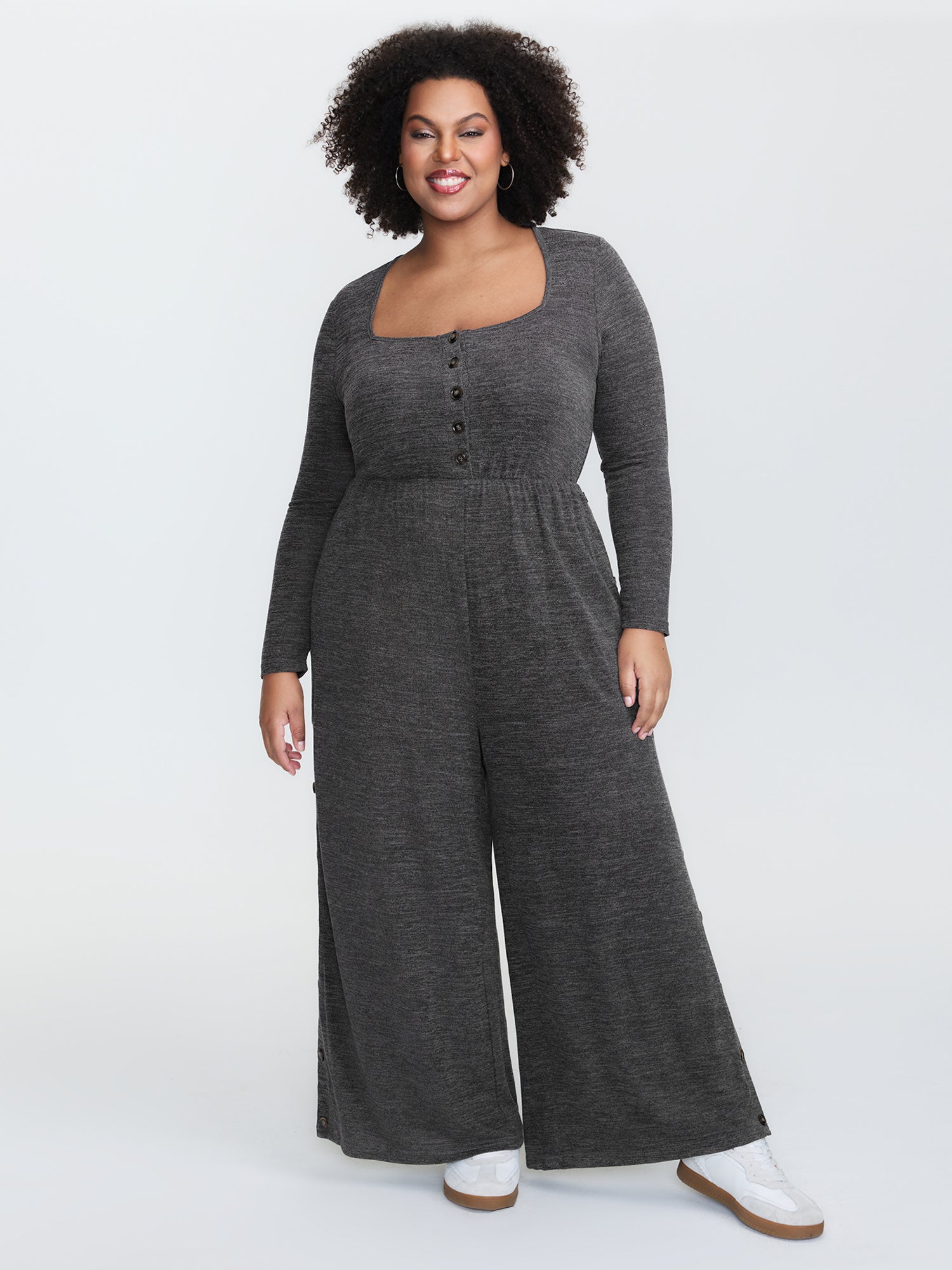 Stretchy Button Placket Wide-Leg Jumpsuit