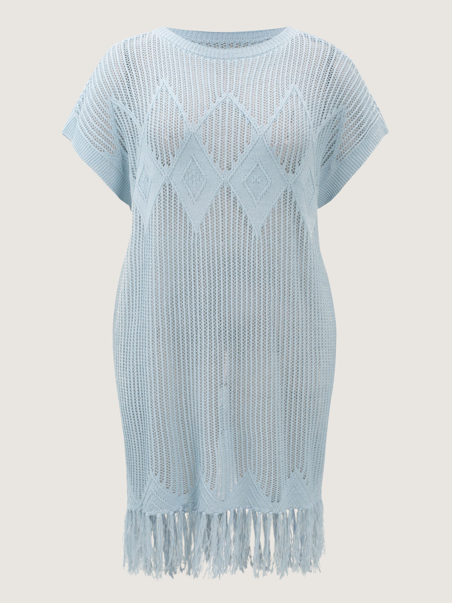 Shop Cut-Out Fringe Hem Swim Cover-Up now and redefine your style with confidence at BloomChic. Tailored for mid and plus-size women. This trendy Swimwear Women, sizes 10-30. Color:Light Blue;Style_2:Resort;Neckline:Round Neck;Sleeve Type:Raglan sleeve;Prints:Non;Details:Tassels, Cut-Out;Pocket:No-pocket;Belt:No-belt;Chest pad:No-chest pad;Lining:No-lining;Closure Type:Non;Swimsuit types:Cover-Up Tunic
