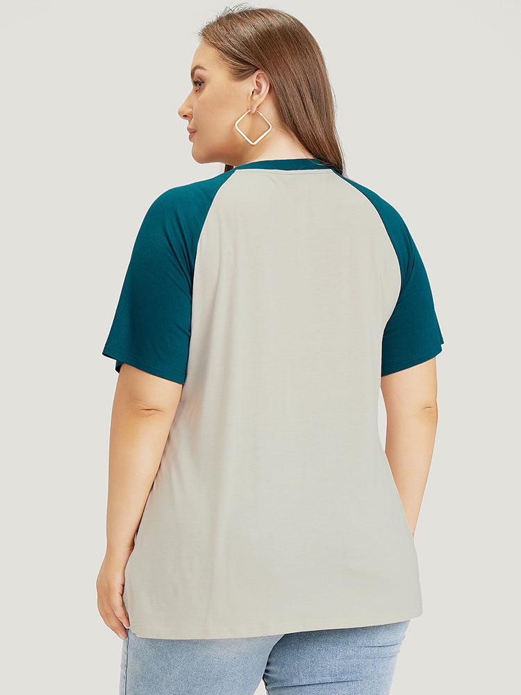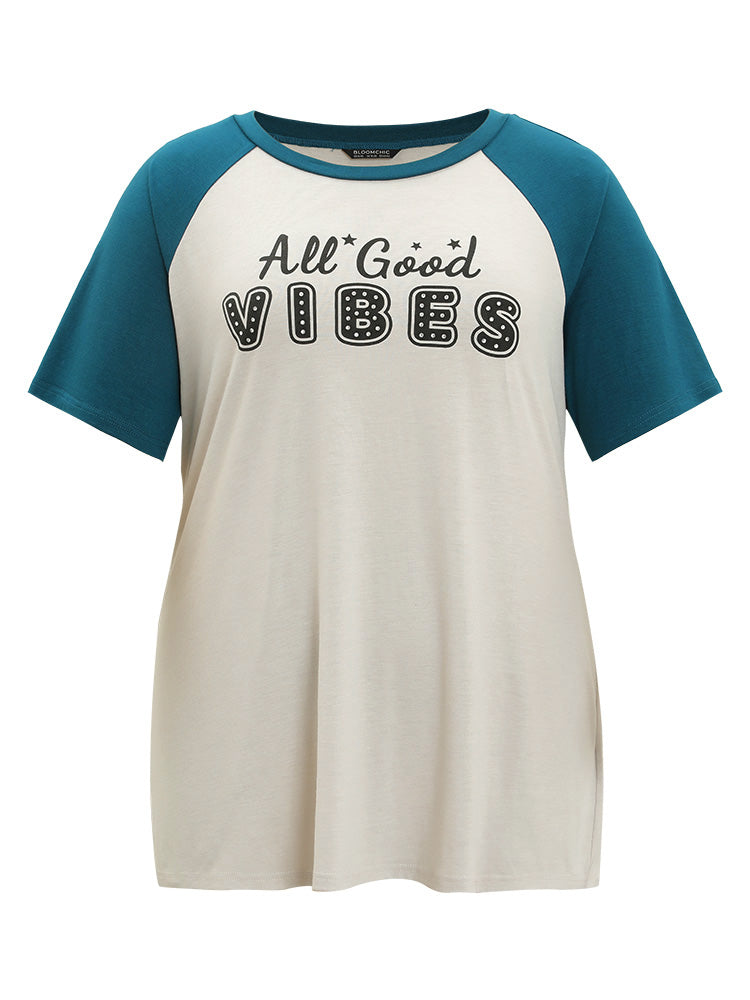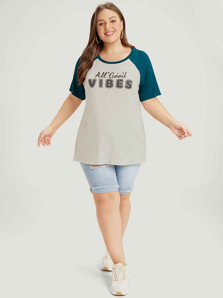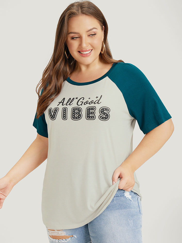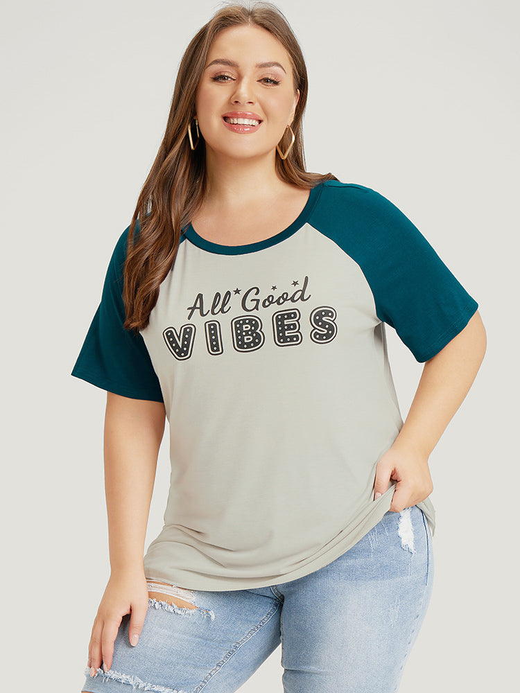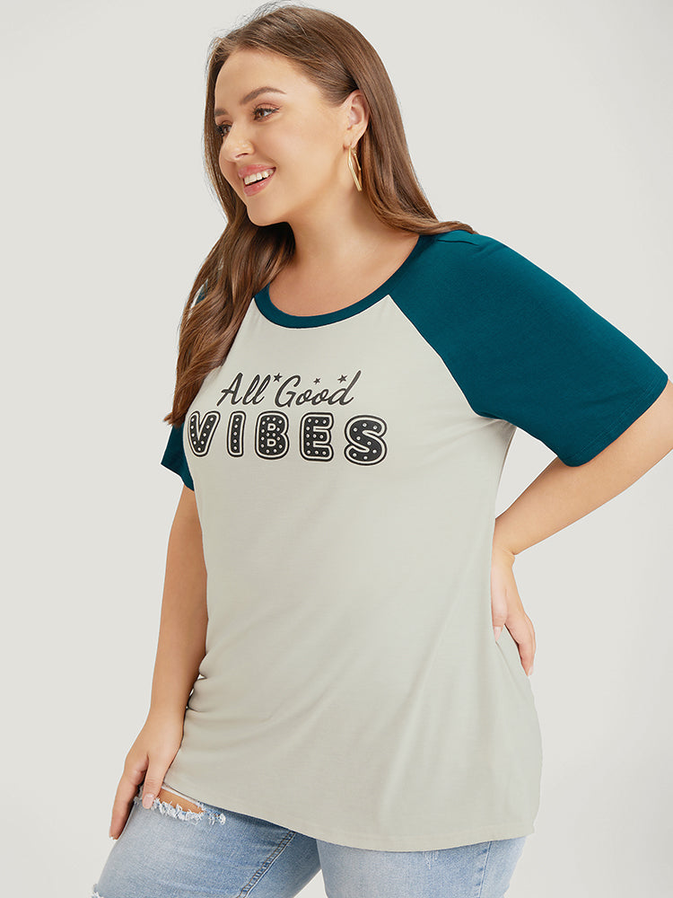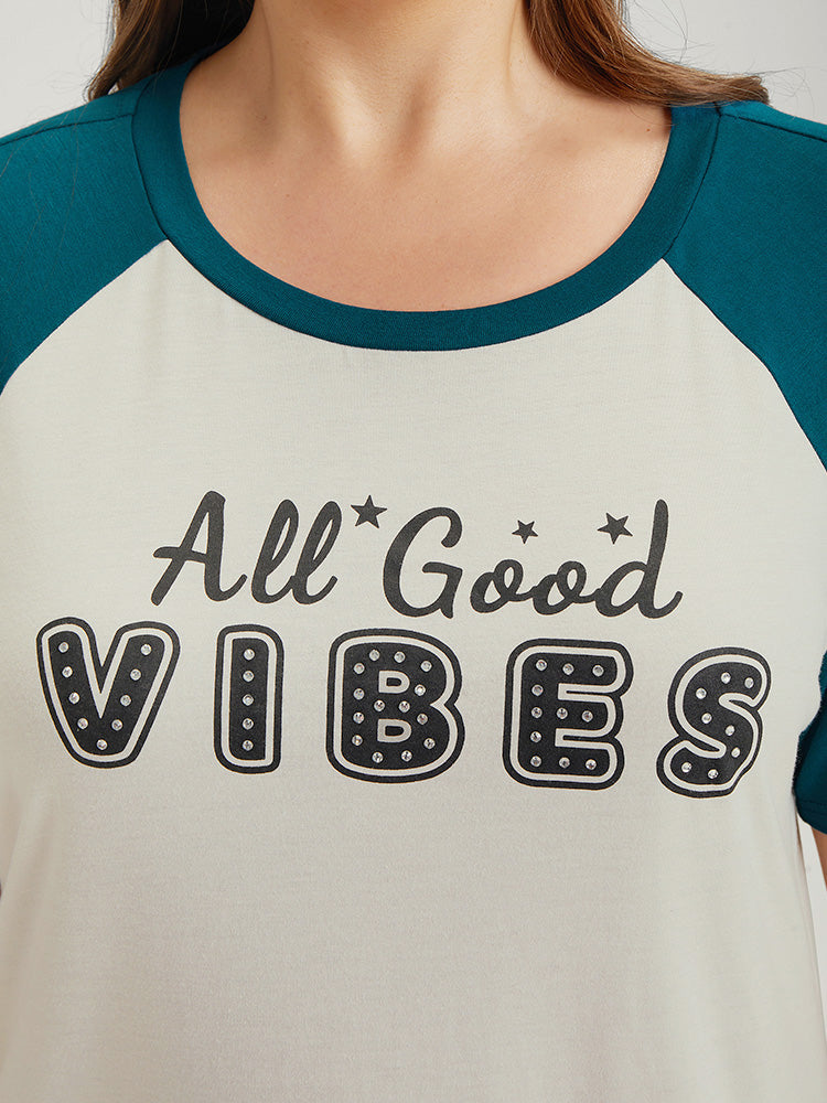 Letter Print Rhinestone Raglan Sleeve Two Tone T-shirt