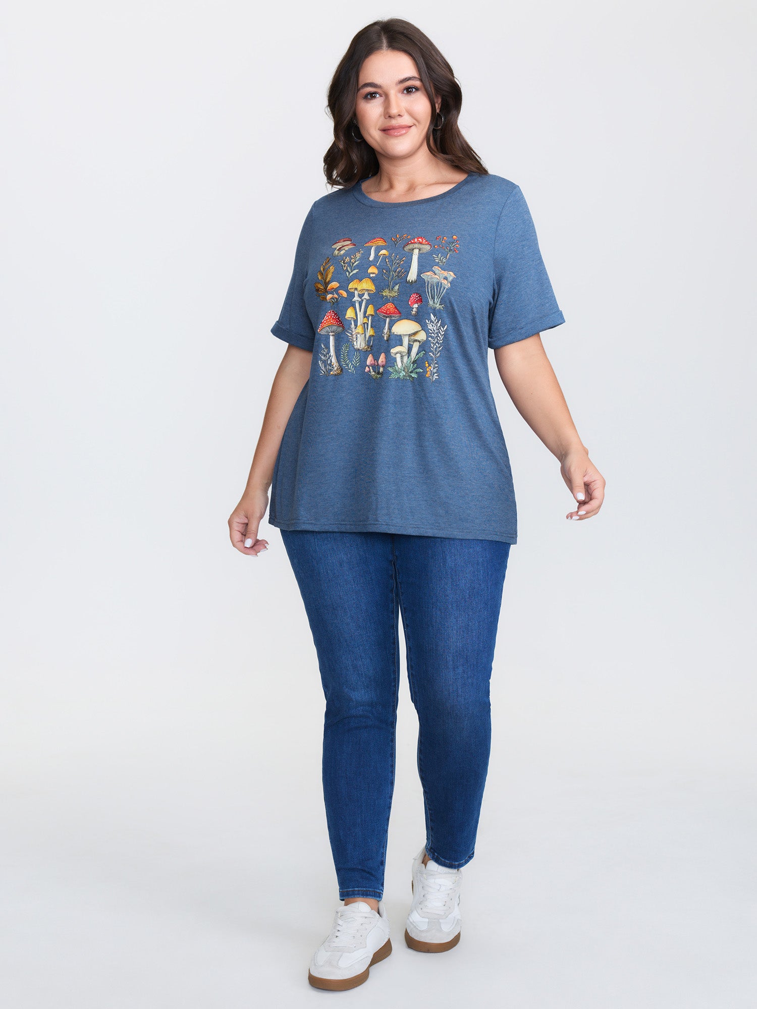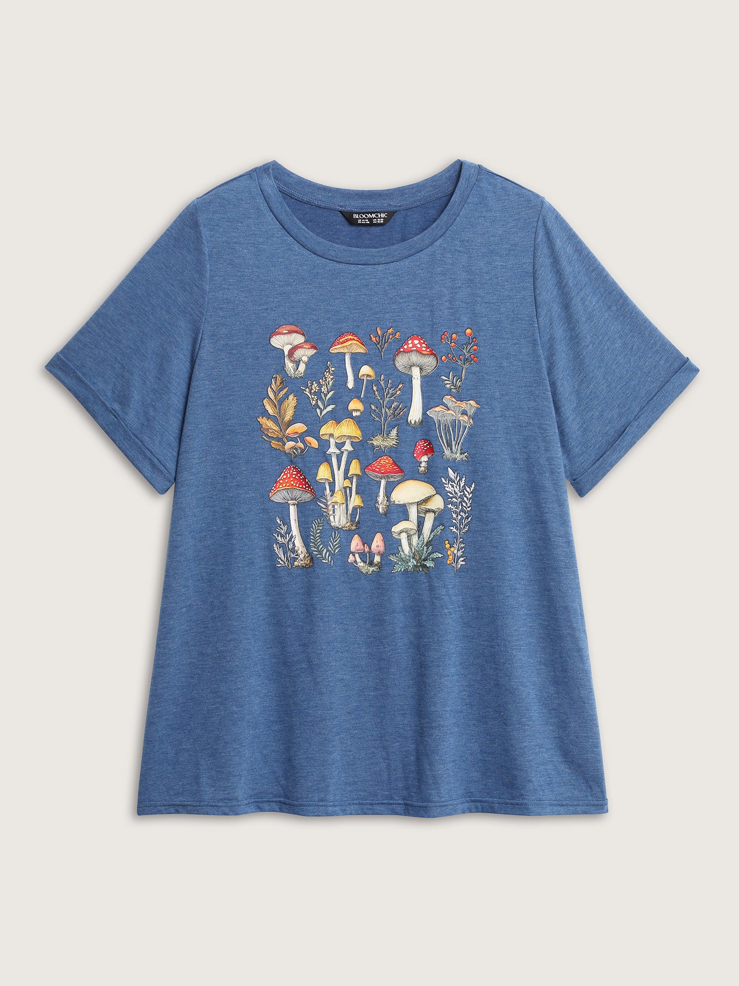 Shop Supersoft Colorful Mushroom Pattern Heather T-Shirt now and redefine your style with confidence at BloomChic. Tailored for mid and plus-size women. This trendy Tops Women, sizes 10-30. Color:Mediumblue;Style:Leisure;Pattern Type:Natural Flowers;Prints:Fruit and vegetable print;Neckline:Round Neck;Sleeve Type:Regular Sleeve;Details:Texture;Pocket:No-pocket