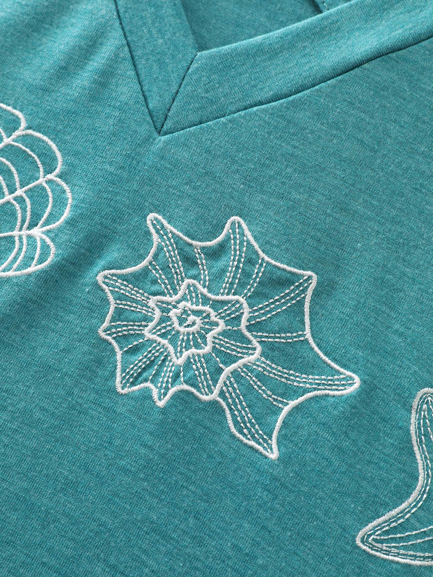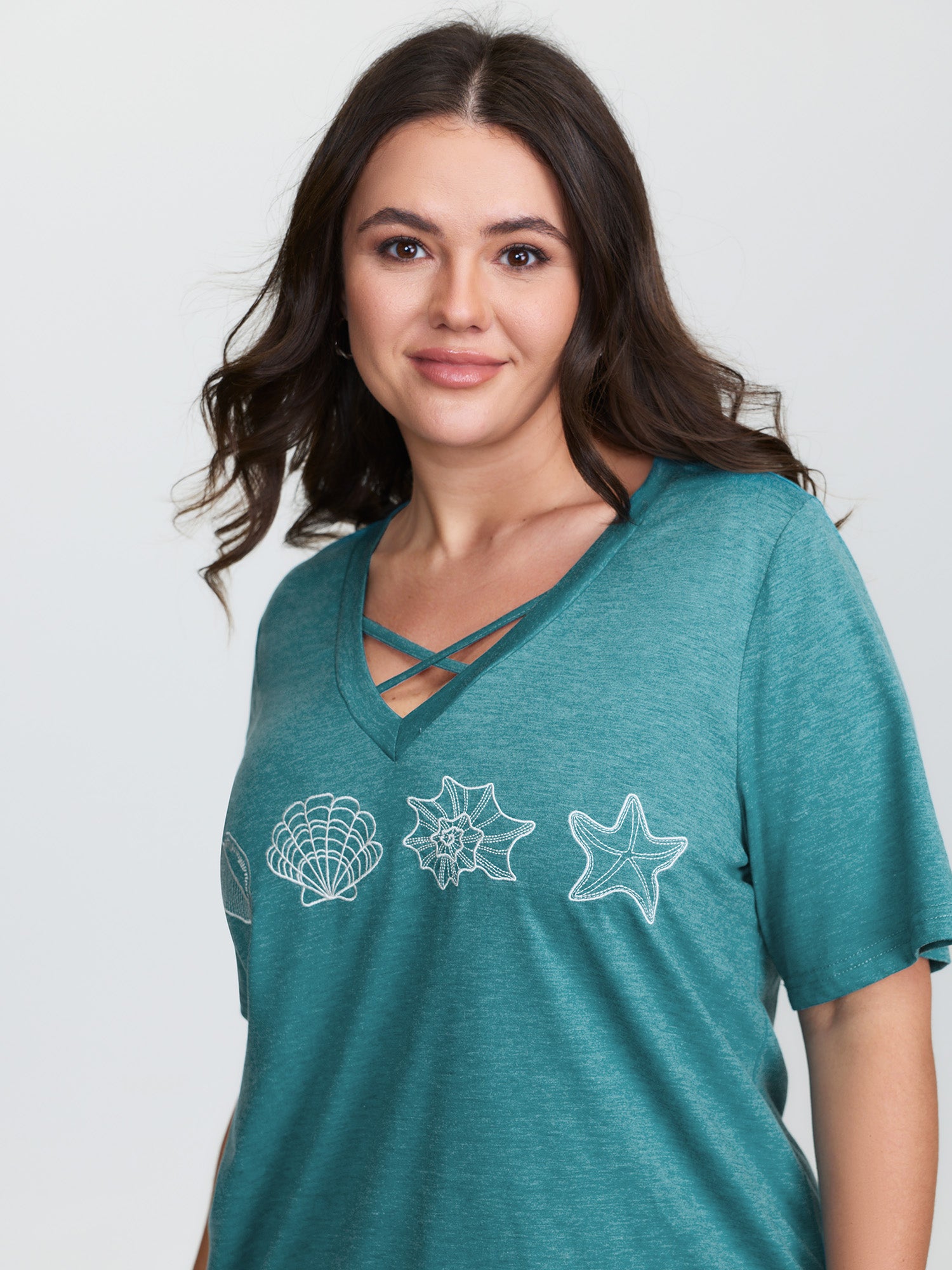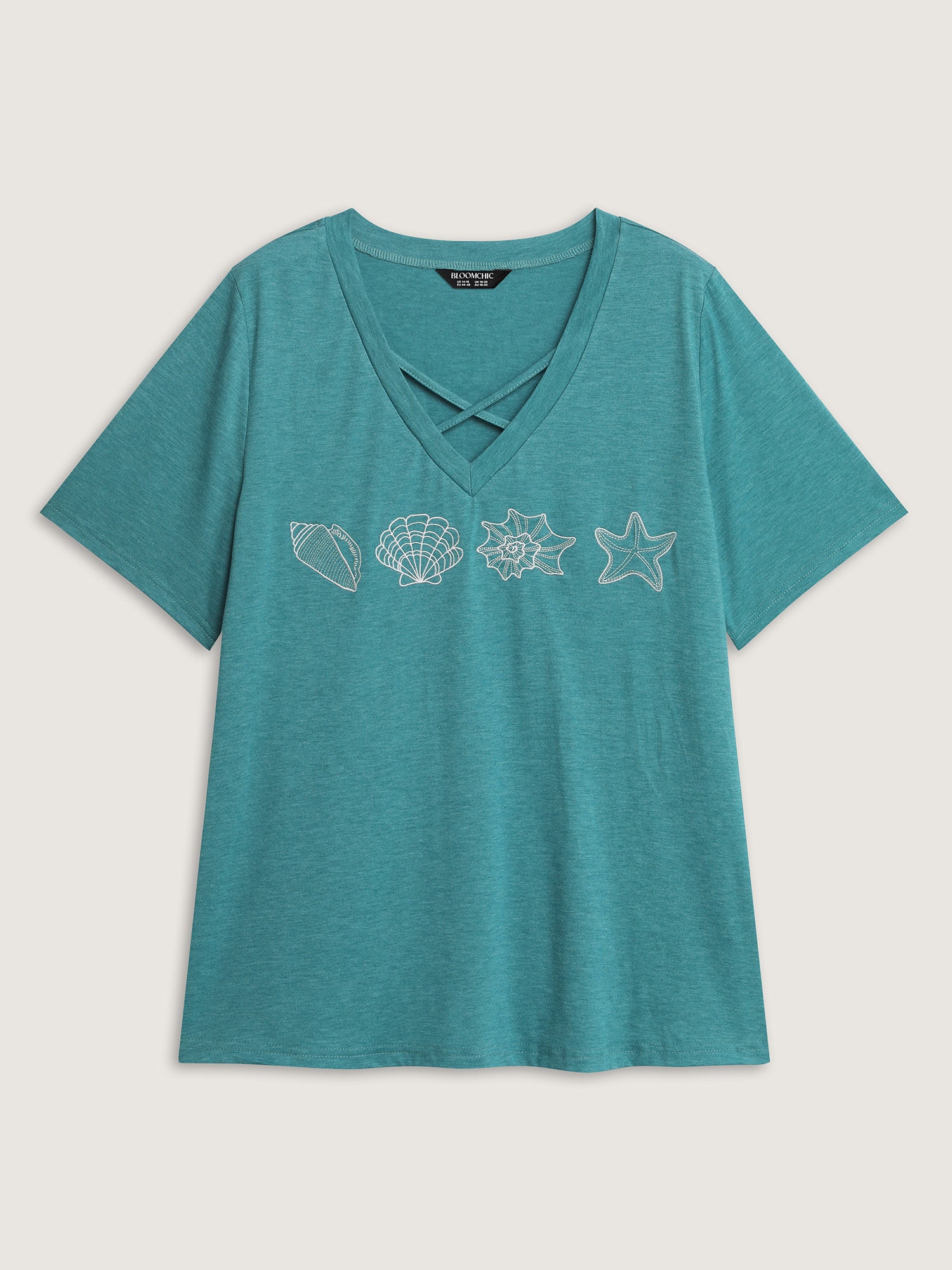 Shop Supersoft Ocean Pattern Embroidered T-Shirt now and redefine your style with confidence at BloomChic. Tailored for mid and plus-size women. This trendy Tops Women, sizes 10-30. Color:Cerulean;Style:Leisure;Pattern Type:Marine;Prints:Marine Elements;Neckline:V-neck;Sleeve Type:Regular Sleeve;Details:Cross straps, Texture, Embroidered;Pocket:No-pocket