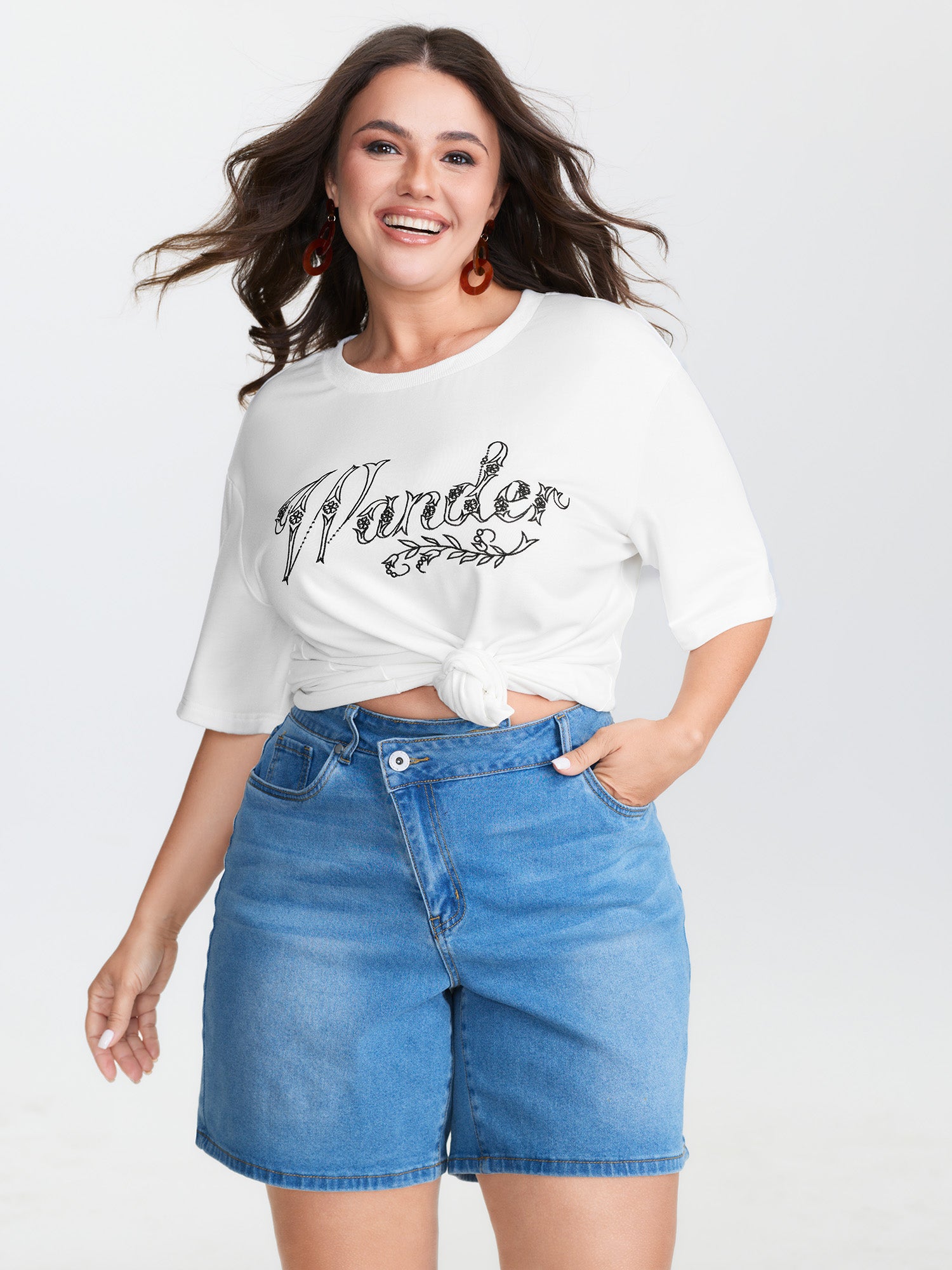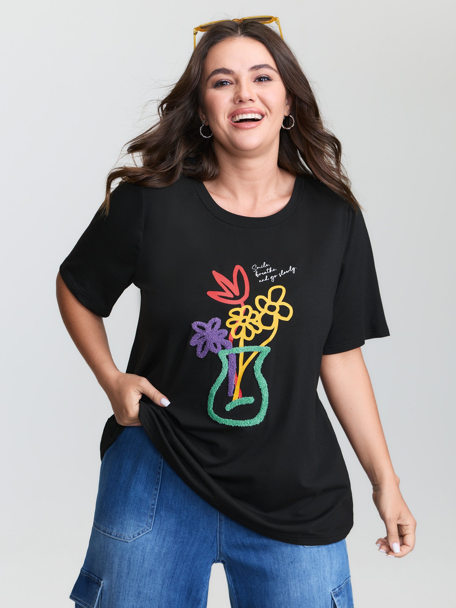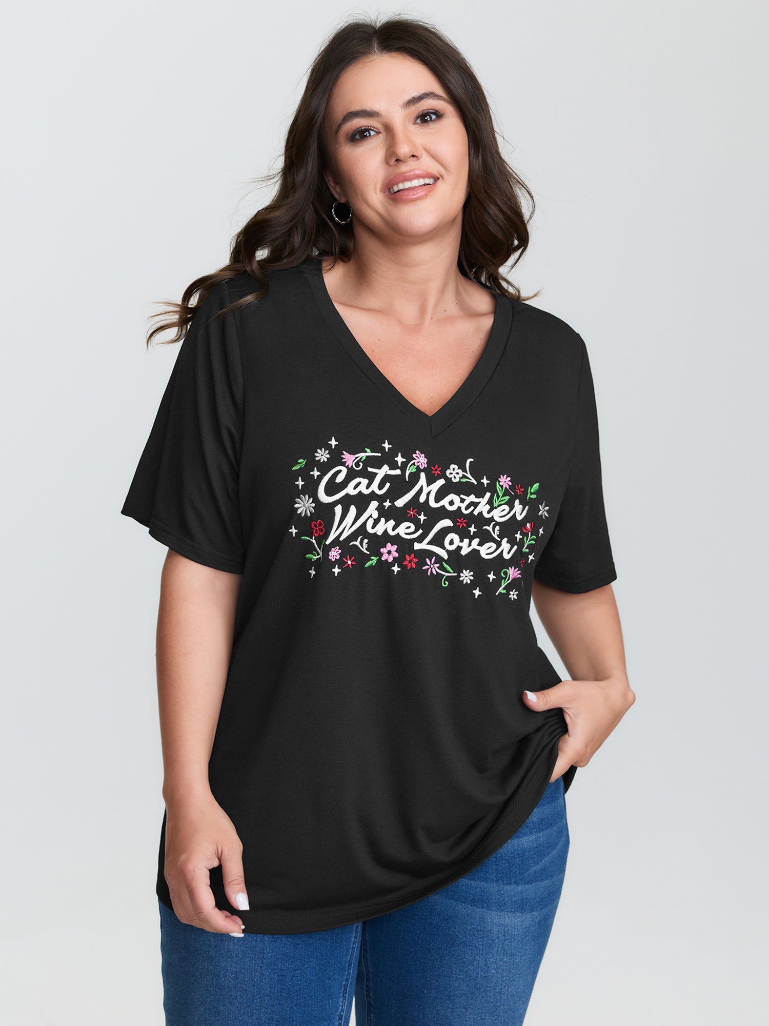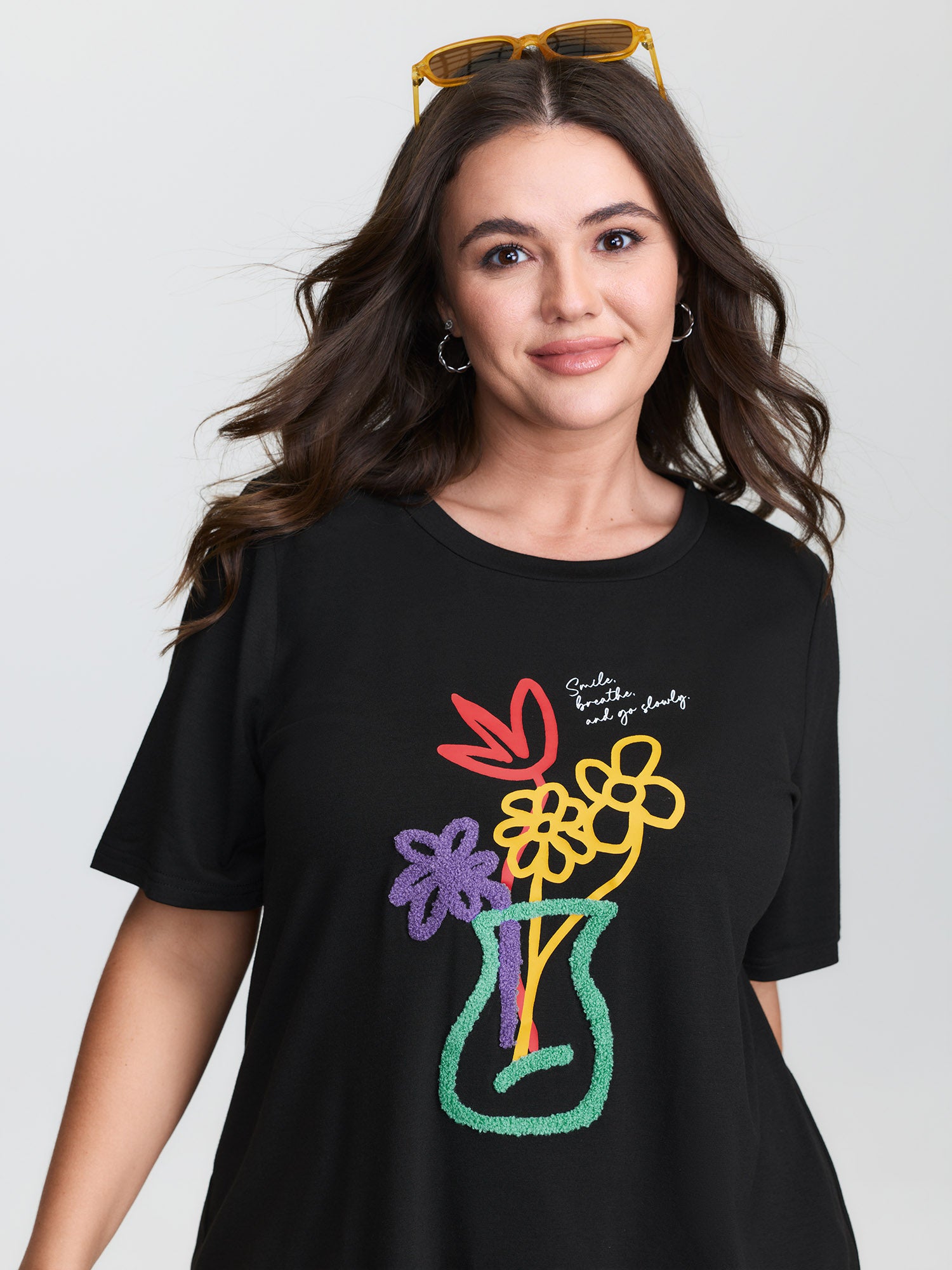 Floral & Slogan Print Slightly Stretchy Casual T-shirt