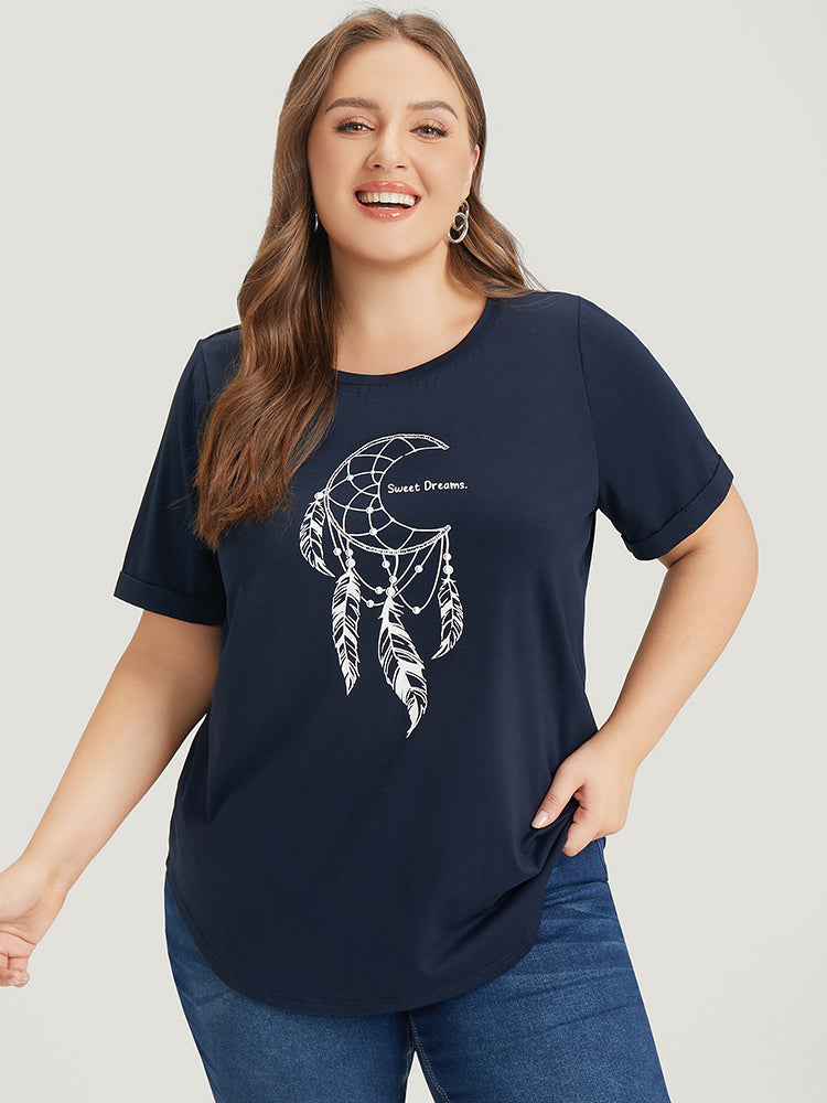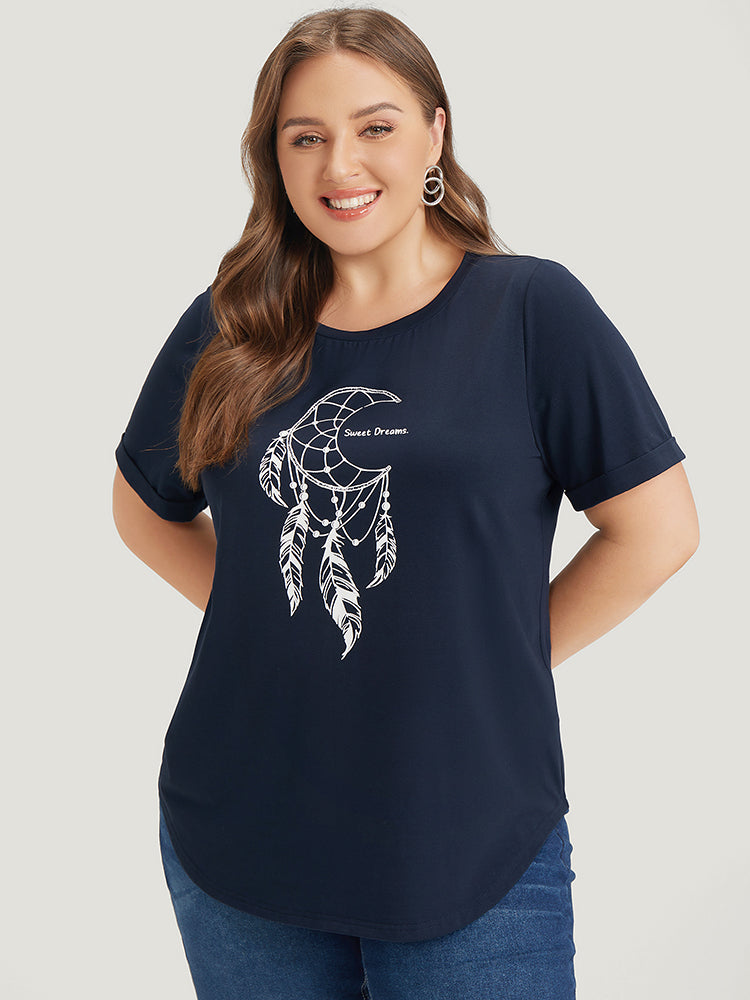 Dream Catcher Print Arc Hem Cuffed Sleeve T-shirt