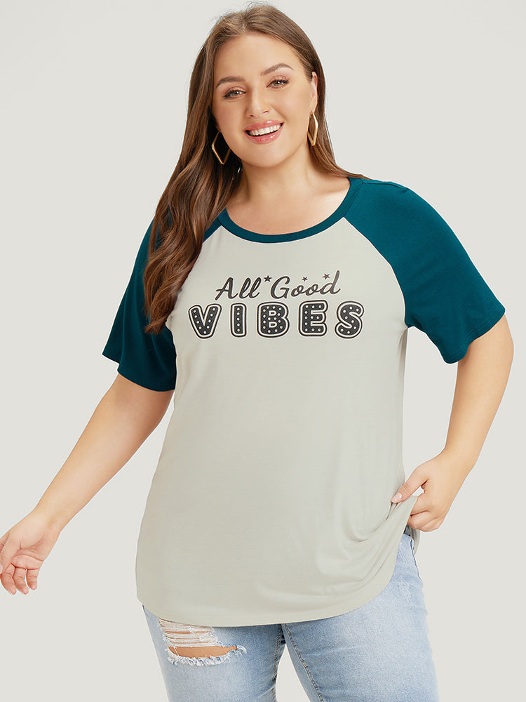 Letter Print Rhinestone Raglan Sleeve Two Tone T-shirt