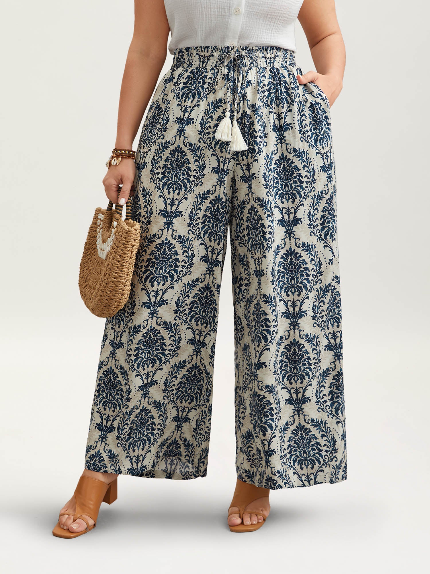 Damask Print Tassel Straight-Leg Pants