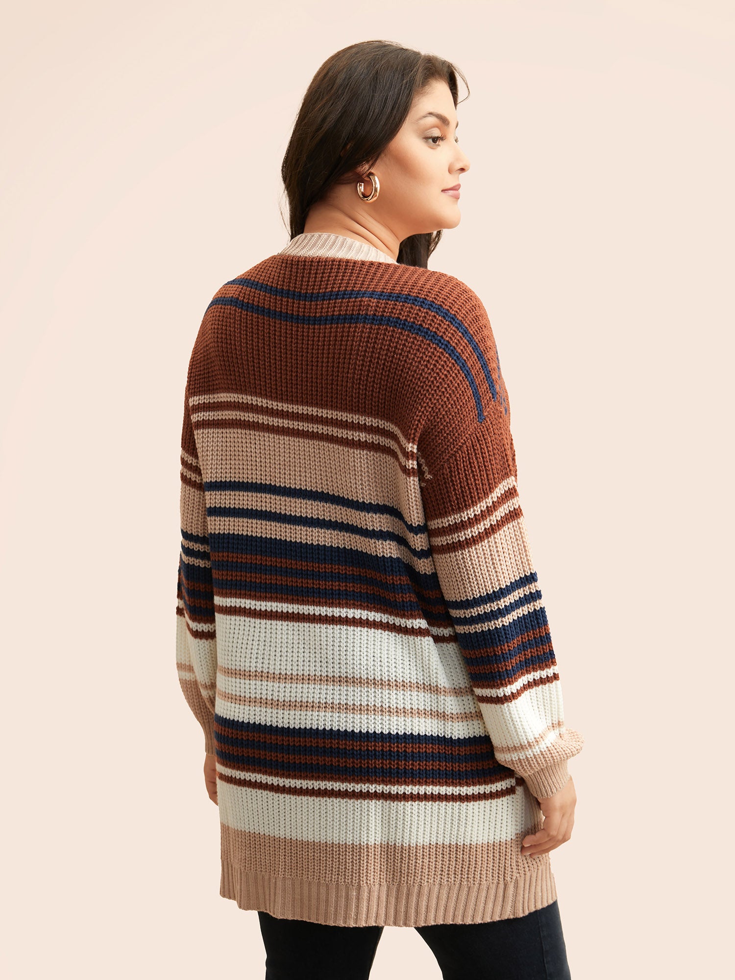 Shop Contrast Striped Pocket Drop Shoulder Cardigan now and redefine your style with confidence at BloomChic. Tailored for mid and plus-size women. This trendy Sweaters Cardigans Women, sizes 10-30. Season:Winter;Color:Browncoffeecolor;Style:Casual;Neckline:Kimono collar;Sleeve Type:Drop shoulder sleeve;Prints:Stripes;Details:Texture, Contrast;Pocket:Patch pocket;Belt:No-belt;Closure Type:Open front without closure