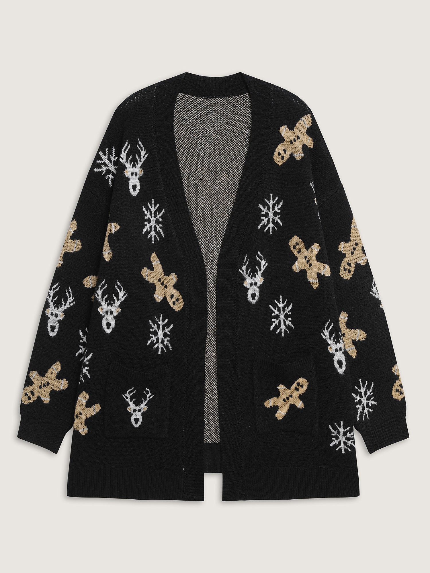Shop Supersoft Gingerbread Holiday Jacquard Pockets Cardigan now and redefine your style with confidence at BloomChic. Tailored for mid and plus-size women. This trendy Sweaters Cardigans Women, sizes 10-30. Color:Black;Style:Leisure;Neckline:Kimono collar;Sleeve Type:Drop shoulder sleeve;Pattern Type:Christmas;Prints:Non;Pocket:Patch pocket;Belt:No-belt;Closure Type:Open front without closure