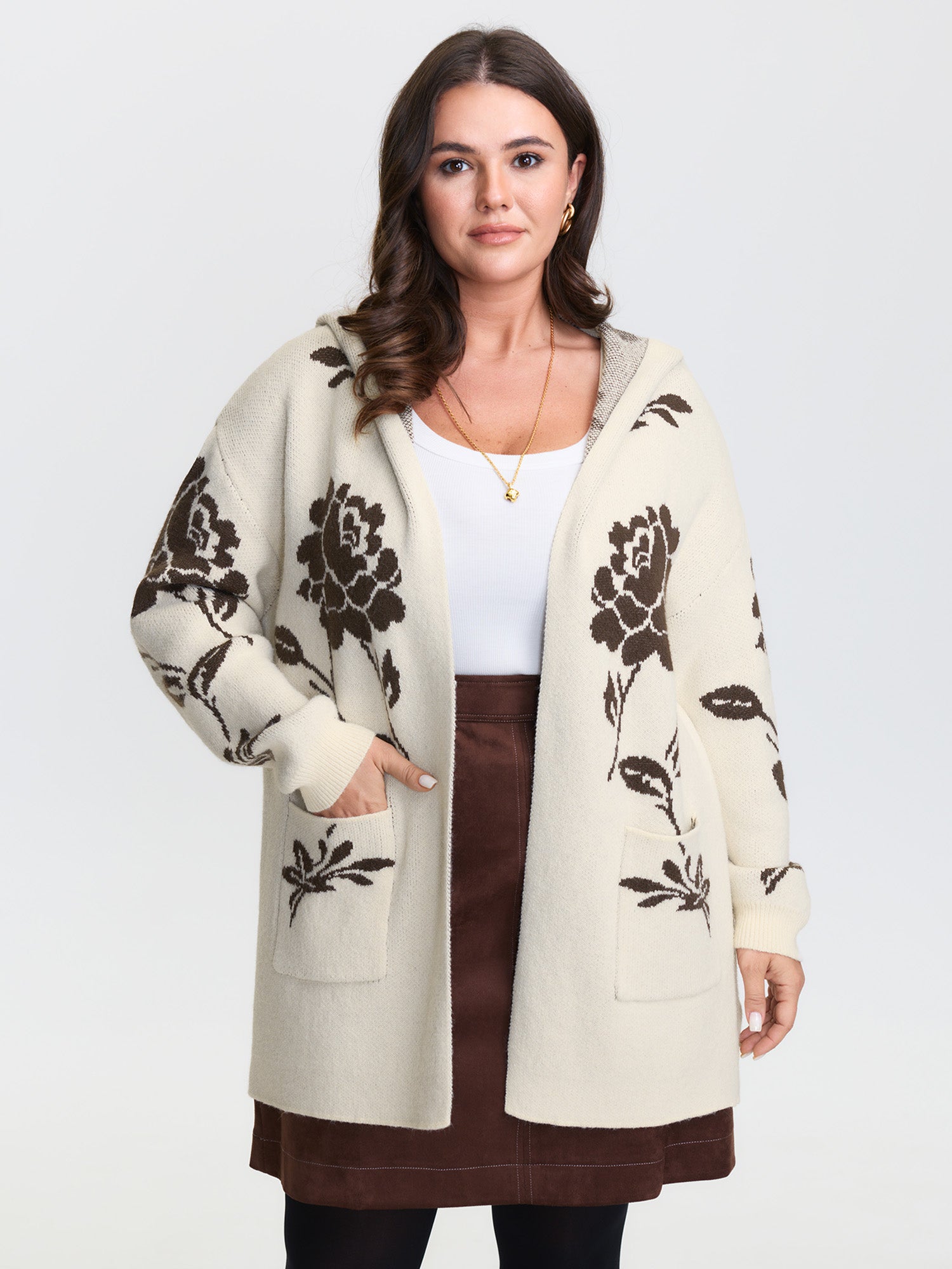 Floral Jacquard Hooded Contrast Knit Cardigan