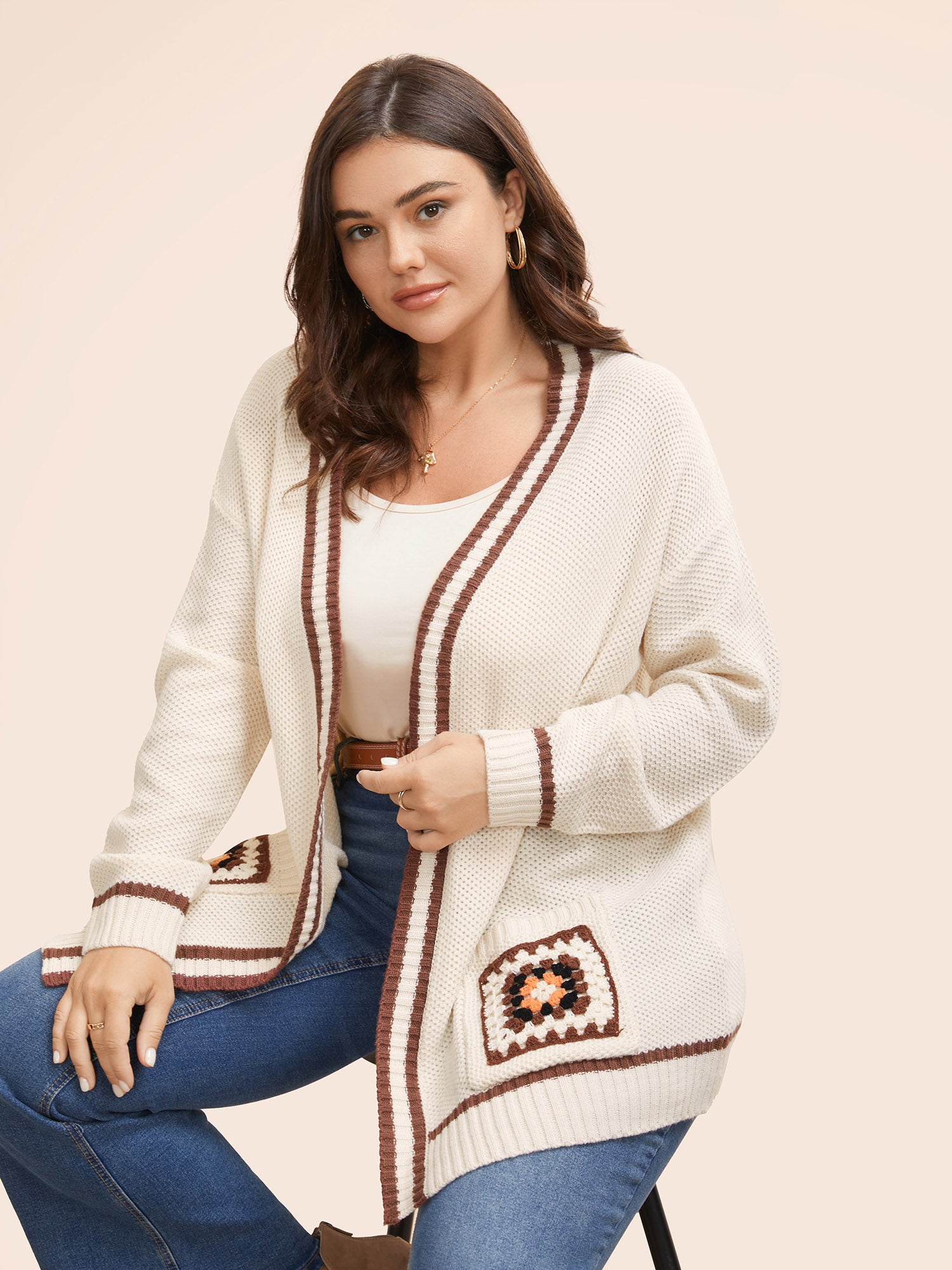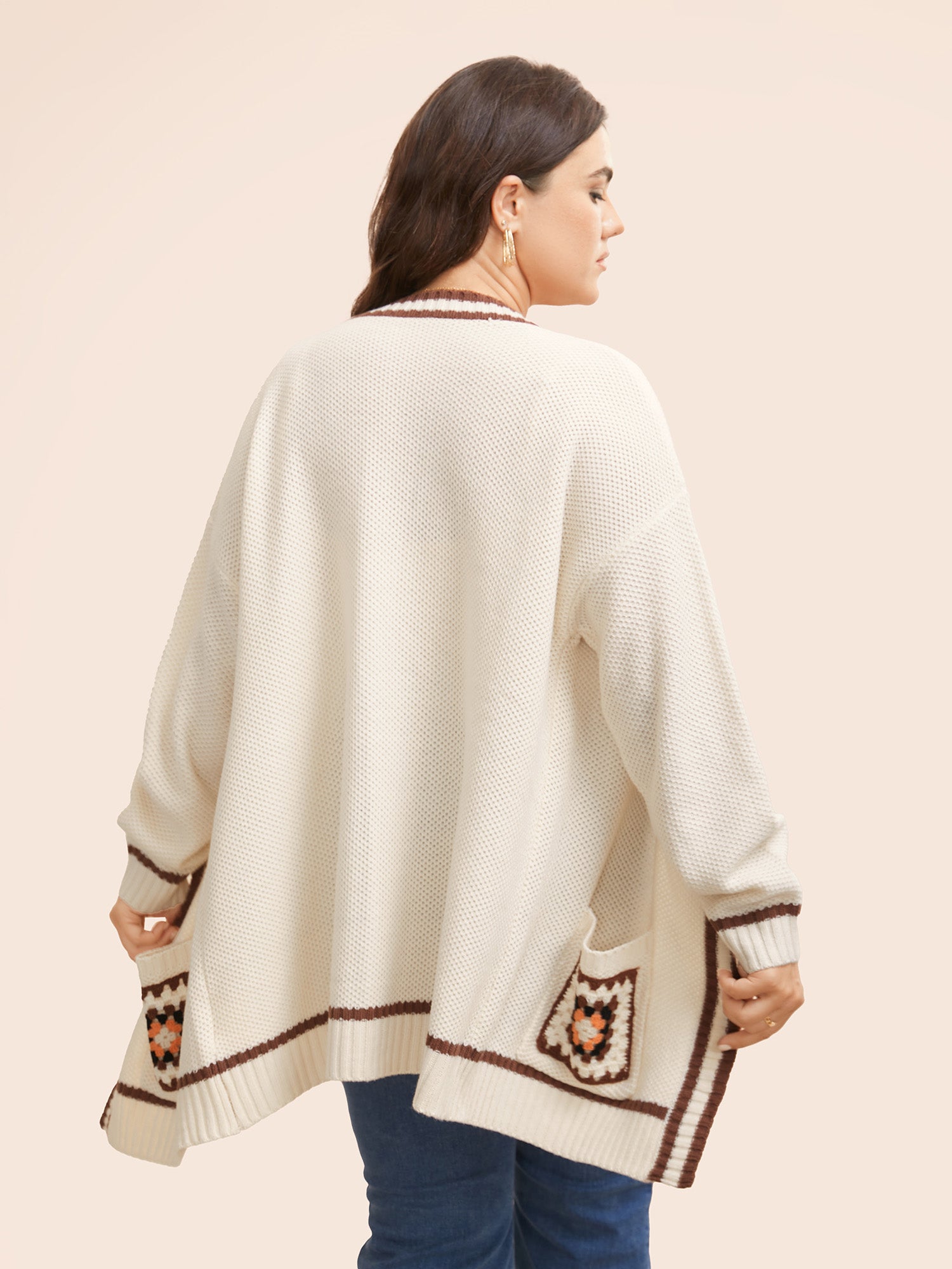 Crochet Floral Patch Pocket Drop Shoulder Cardigan