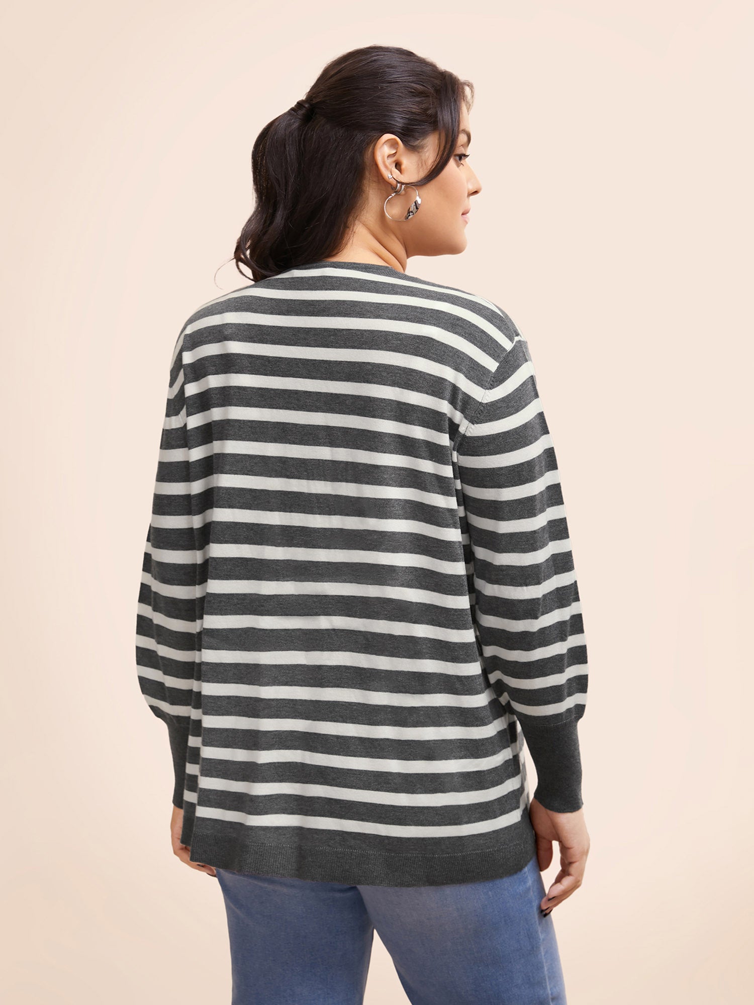 Striped Lantern Sleeve Patched Pocket Cardigan