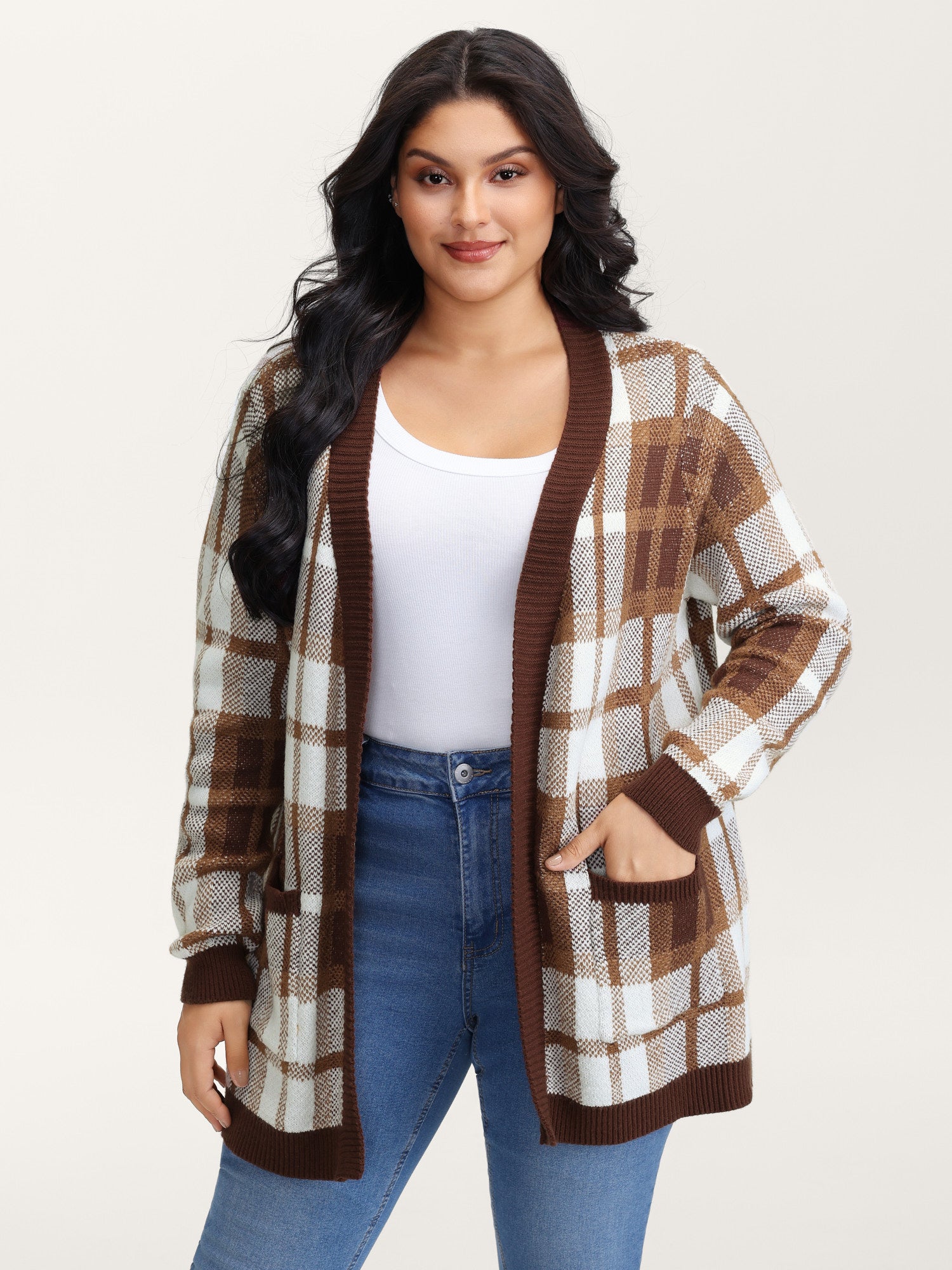 Supersoft Check Pattern Curvy Hem Pockets Cardigan