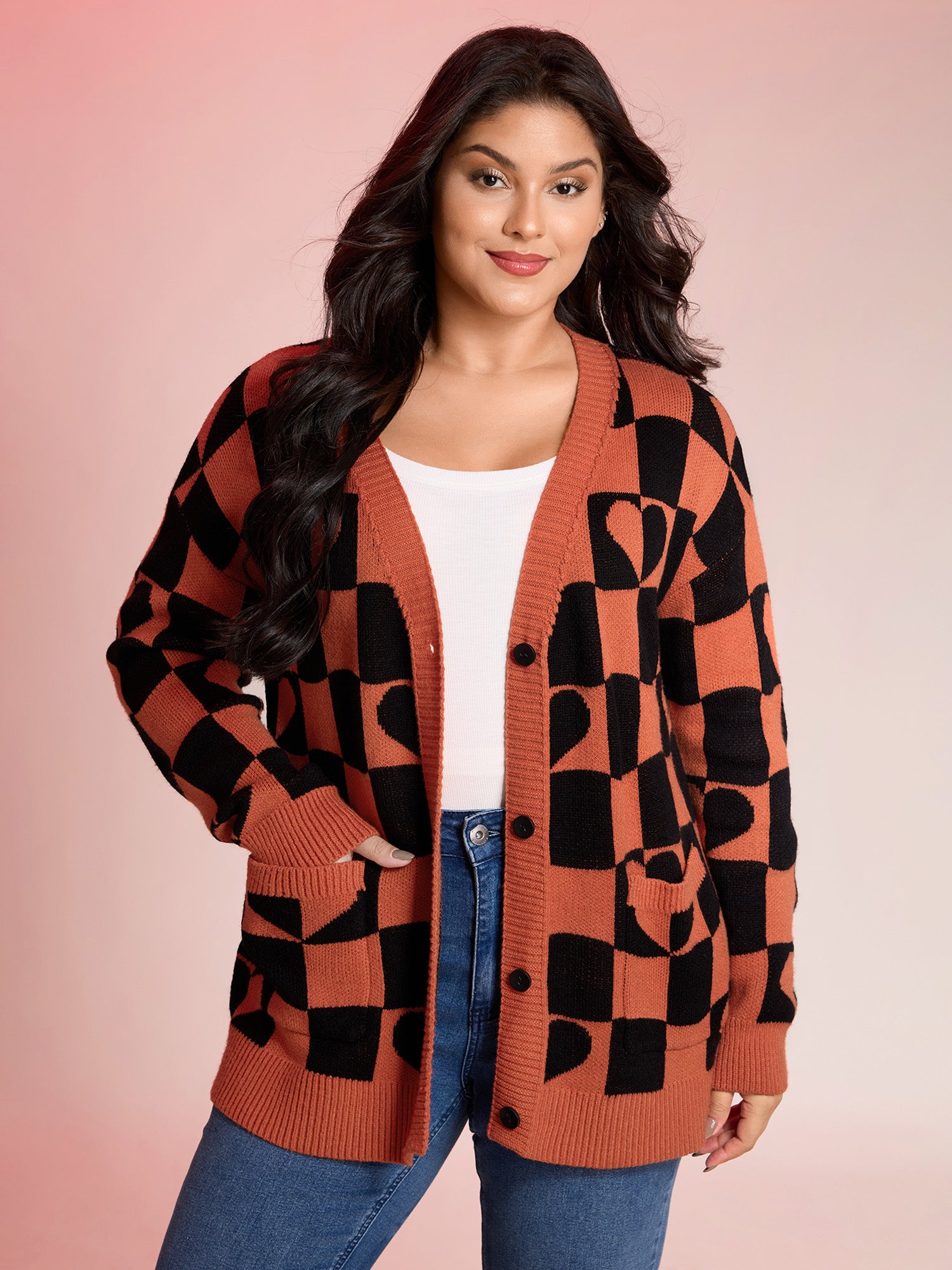 Checkered Jacquard Hooded Pockets Knit Cardigan