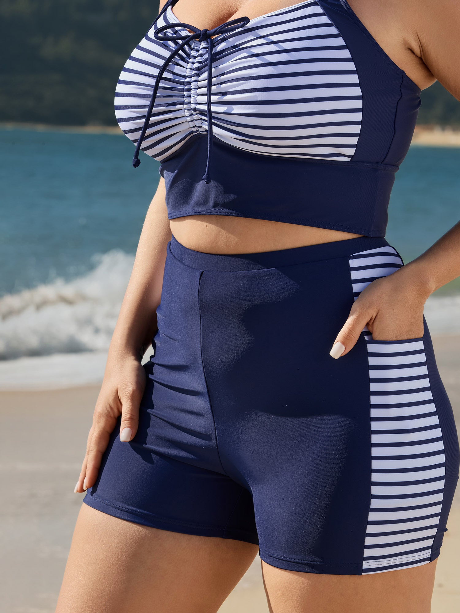Shop Side Striped Pockets Swim Bottoms now and redefine your style with confidence at BloomChic. Tailored for mid and plus-size women. This trendy Swimwear Women, sizes 10-30. Color:Navy;Style:Resort;Waist Design:High Rise;Prints:Stripes;Details:Contrast;Pocket:Patch pocket;Belt:No-belt;Lining:Lining;Closure Type:Non;Structural function:Full Coverage;Swimsuit types:Borad Shorts;Functional Fabric:UPF 50 Sun Protection