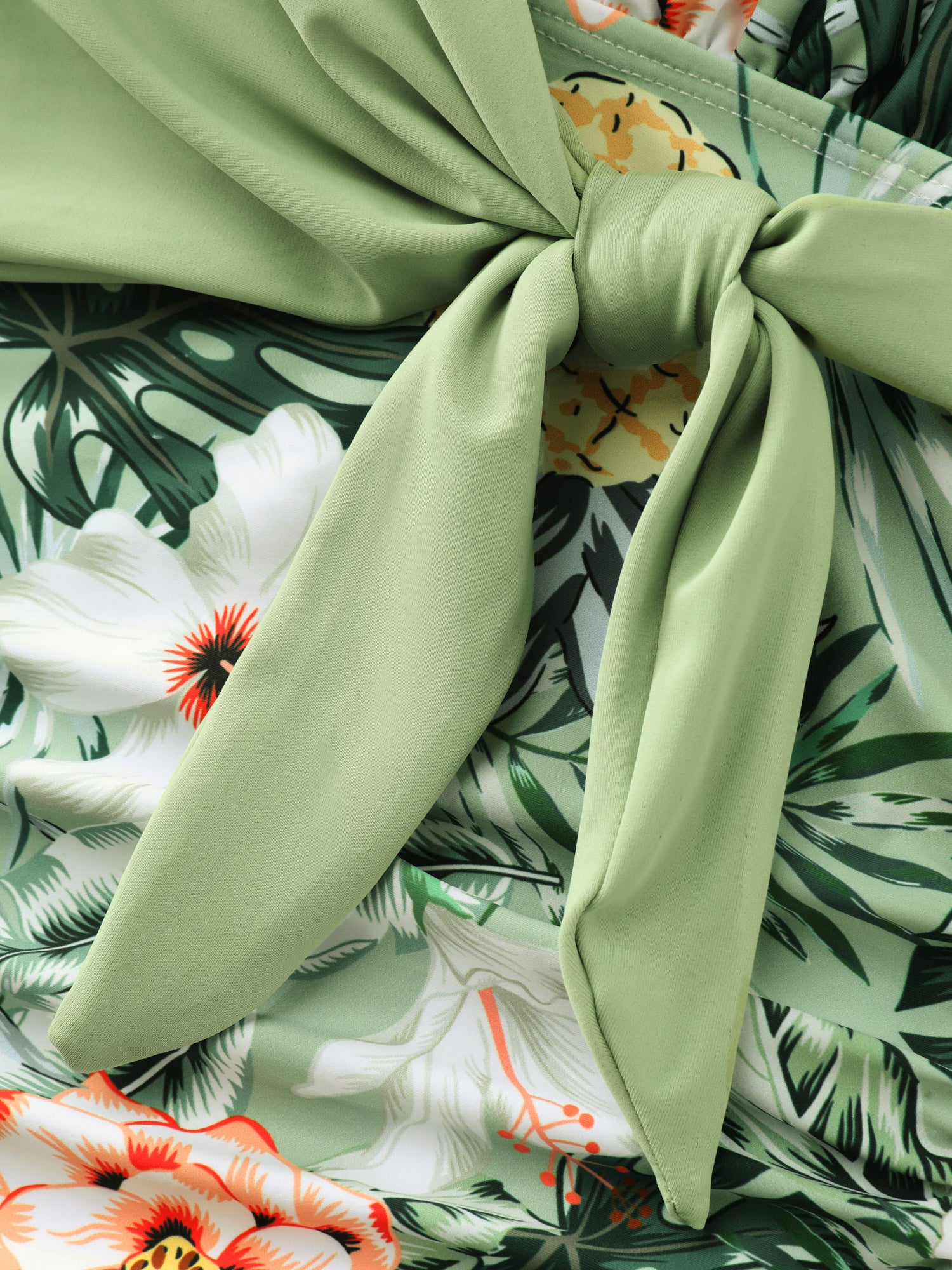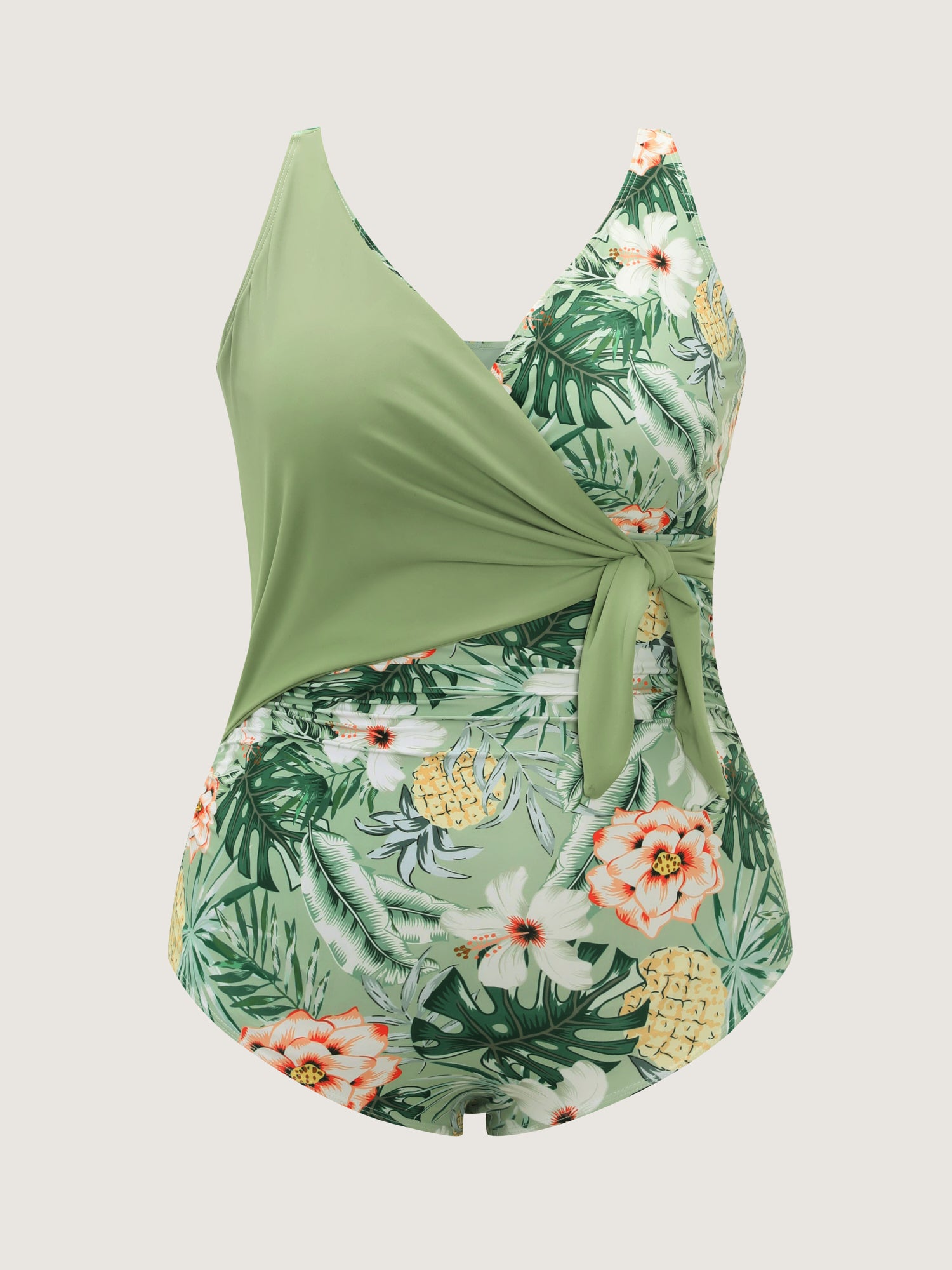 Shop Tropical Floral Print Knotted One-Piece Swimsuit now and redefine your style with confidence at BloomChic. Tailored for mid and plus-size women. This trendy Swimwear Women, sizes 10-30. Color:Green Bean;Style_2:Resort;Cup Type:Removable cups;Neckline:Overlap Collar;Sleeve Type:Sleeveless;Prints:Tropical;Details:Tie knot, Contrast;Pocket:No-pocket;Belt:No-belt;Chest pad:Removable Padding;Lining:Lining;Closure Type:Non;Structural function:Tummy-Sculpt,Adaptive-Fit;Swimsuit types:One-Piece Swimsuit