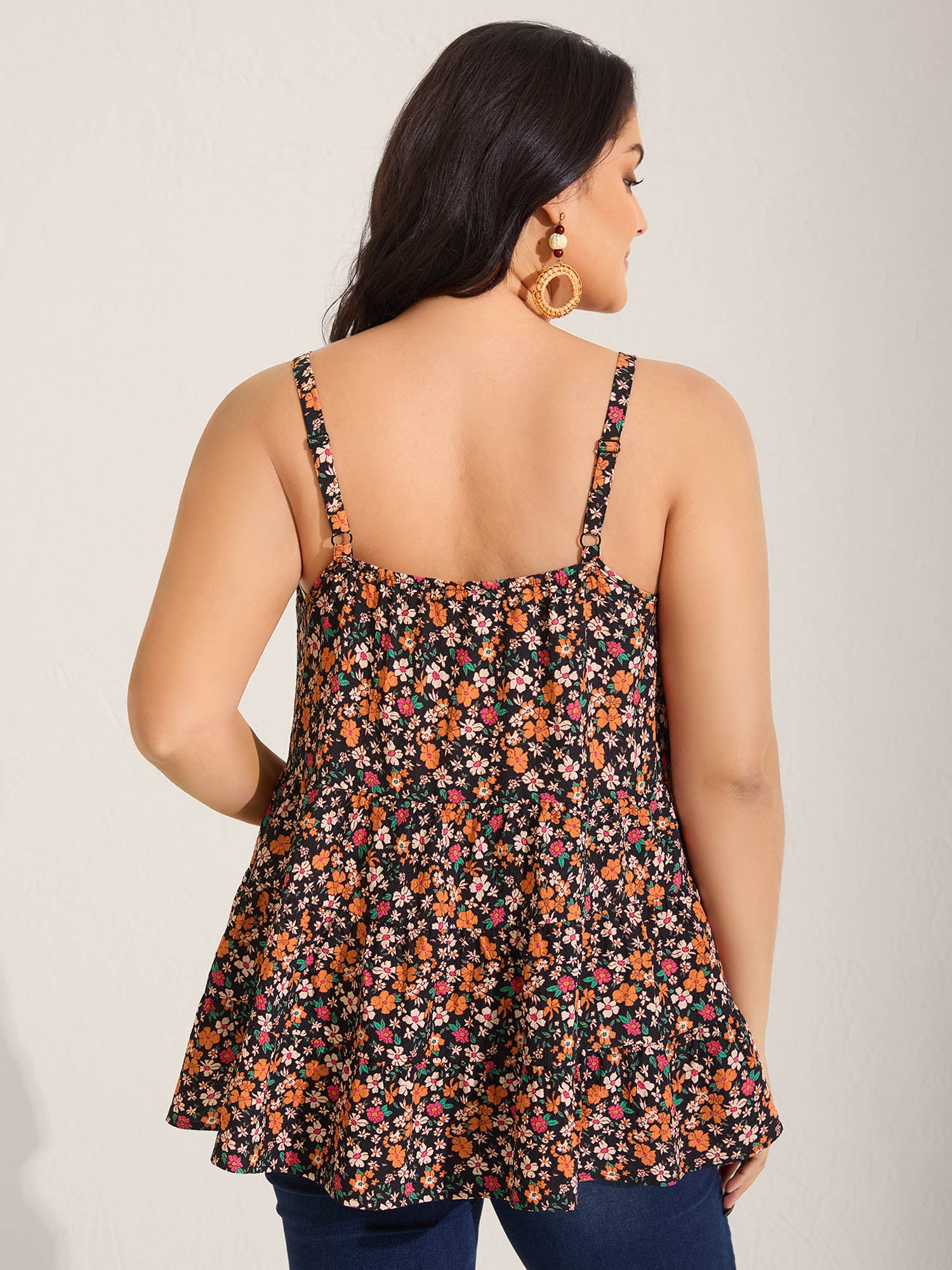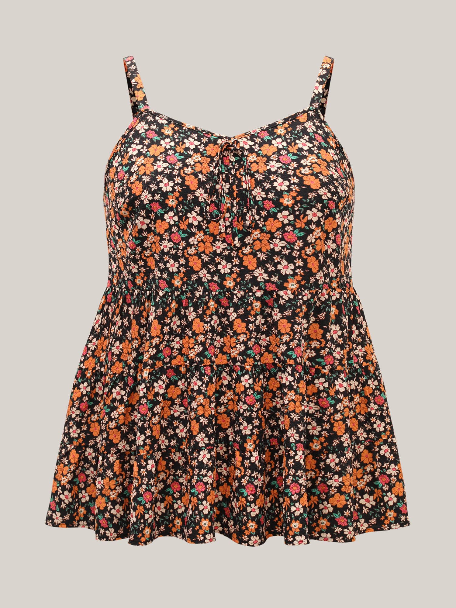 Shop Ditsy Floral Print Cami Tiered Tank Top now and redefine your style with confidence at BloomChic. Tailored for mid and plus-size women. This trendy Tops Women, sizes 10-30. Color:BlackFlower;Pattern Type:Natural Flowers;Prints:Floral;Neckline:Non;Sleeve Type:Sleeveless;Details:Tie knot, Gathered, Ruffles;Pocket:No-pocket