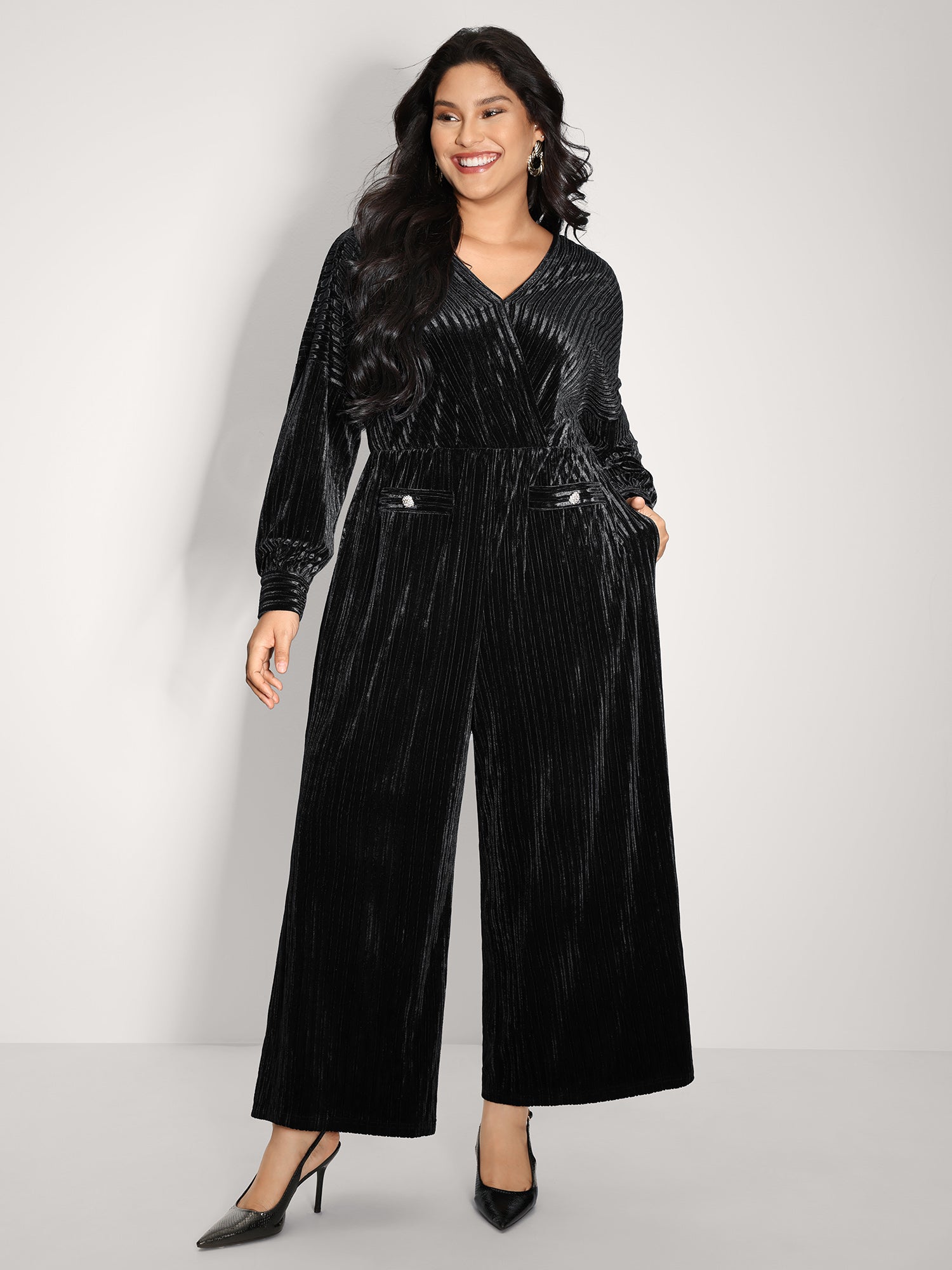 Textured Velvet Sheer Back Pockets Jumpsuit