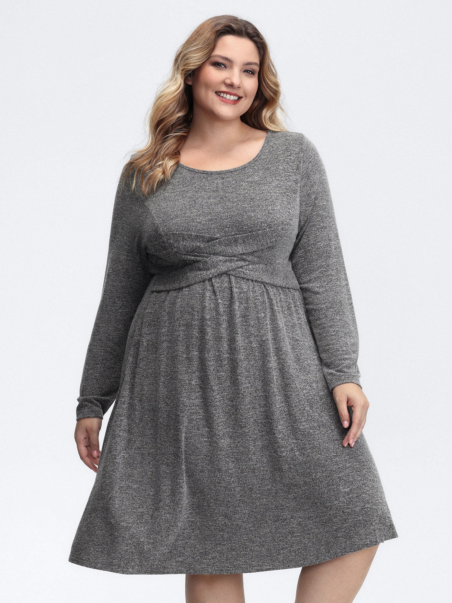 Crossover Waist-Defining Round Neck Midi Dress