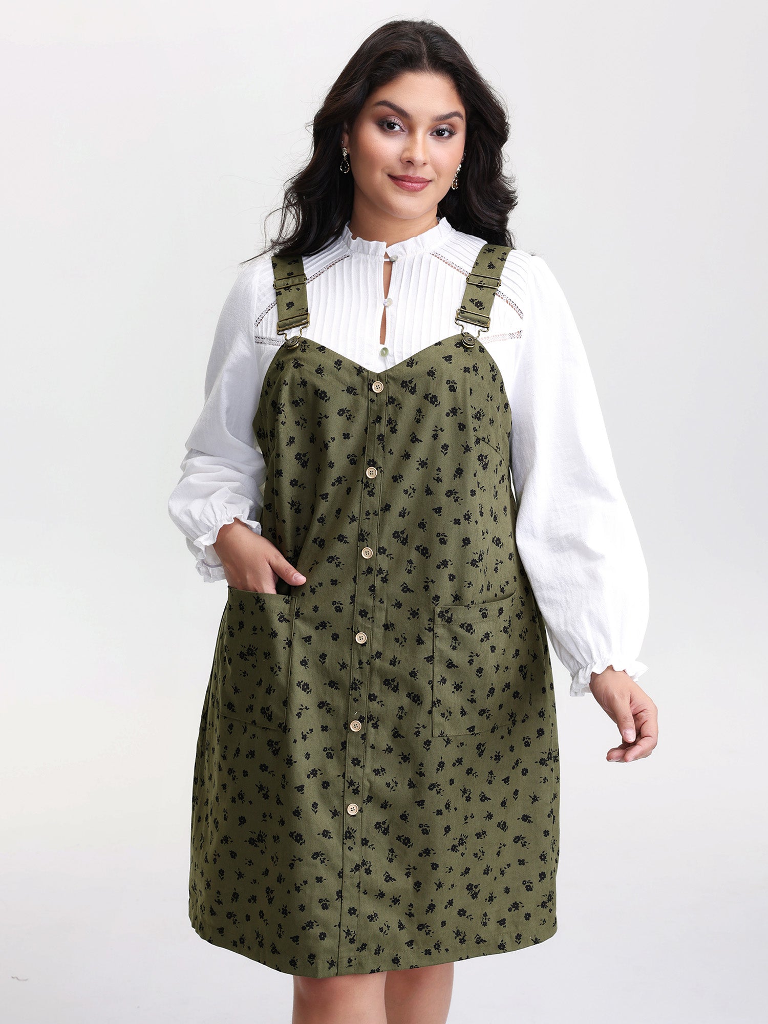 Floral Print Textured Overall Adjustable Midi Dress