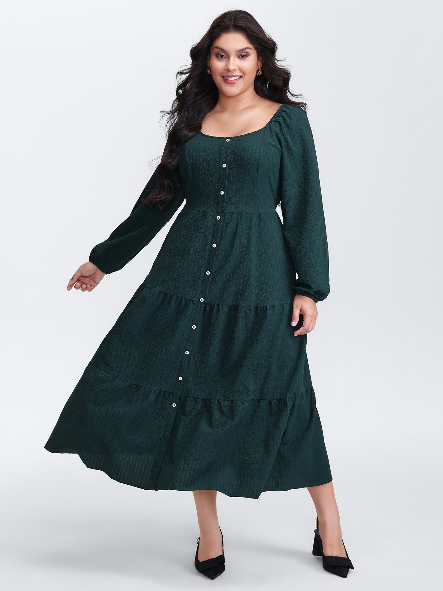 Textured Pockets Button Detail Tiered Maxi Dress